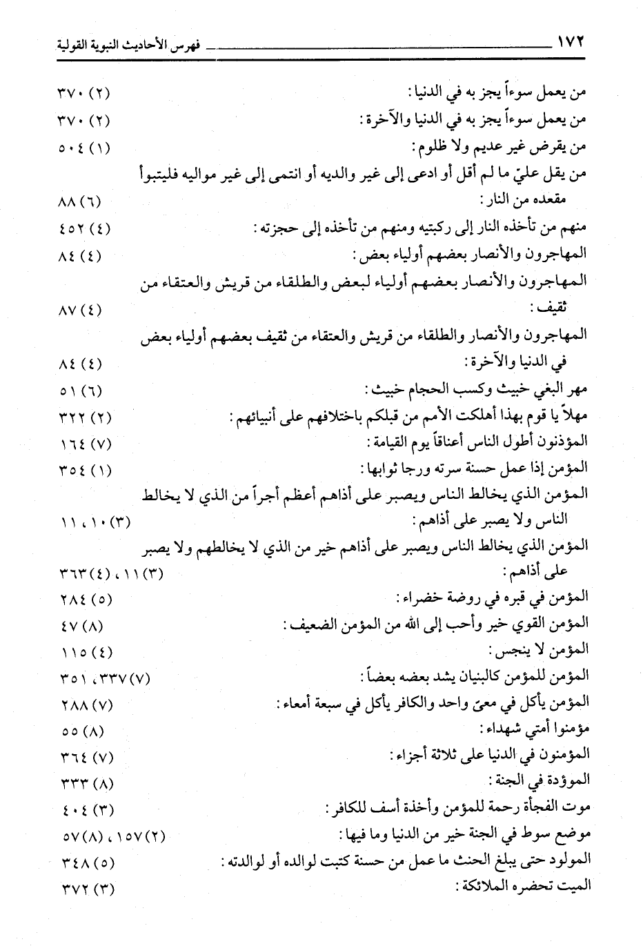 مَنْ يَعْمَلْ سُوءًا يُجْزَ بِهِ فِي الدُّنْيَا: (2) 370 مَنْ يَعْمَلْ سُوءًا يُجْزَ بِهِ فِي الدُّنْيَا والآخرة: (2) 370 من يقرض غير عديم ولا ظلوم: (1) 504 مَنْ يَقُلْ عَلَيَّ مَا لَمْ أَقُلْ أَوِ ادَّعَى إِلَى غَيْرِ وَالِدَيْهِ أَوِ انْتَمَى إِلَى غير مواليه فليتبوأ مقعده من النار: (6) 88 مِنْهُمْ مَنْ تَأْخُذُهُ النَّارُ إِلَى رُكْبَتَيْهِ وَمِنْهُمْ من تأخذه إلى حجزته: (4) 452 المهاجرون والأنصار بعضهم أولياء بعض: (4) 84 المهاجرون والأنصار بعضهم أولياء لِبَعْضٍ وَالطُّلَقَاءُ مِنْ قُرَيْشٍ وَالْعُتَقَاءُ مِنْ ثَقِيفٍ: (4) 87 الْمُهَاجِرُونَ وَالْأَنْصَارُ وَالطُّلَقَاءُ مِنْ قُرَيْشٍ وَالْعُتَقَاءُ مِنْ ثَقِيفَ بَعْضُهُمْ أَوْلِيَاءُ بَعْضٍ فِي الدُّنْيَا وَالْآخِرَةِ: (4) 84 مهر البغي خبيث وكسب الحجام خبيث: (6) 51 مَهْلًا يَا قَوْمُ بِهَذَا أُهْلِكَتِ الْأُمَمُ مَنْ قبلكم باختلافهم على أنبيائهم: (2) 322 المؤذنون أطول الناس أعناقا يوم القيامة: (7) 164 الْمُؤْمِنُ إِذَا عَمِلَ حَسَنَةً سَرَّتْهُ وَرَجَا ثَوَابَهَا: (1) 354 الْمُؤْمِنُ الَّذِي يُخَالِطُ النَّاسَ وَيَصْبِرُ عَلَى أَذَاهُمْ أَعْظَمُ أَجْرًا مِنَ الَّذِي لَا يُخَالِطُ النَّاسَ ولا يصبر على أذاهم: (3) 10، 11 الْمُؤْمِنُ الَّذِي يُخَالِطُ النَّاسَ وَيَصْبِرُ عَلَى أَذَاهُمْ خَيْرٌ مِنَ الَّذِي لَا يُخَالِطُهُمْ وَلَا يَصْبِرُ على أذاهم: (3) 11، (4) 363 المؤمن في قبره في روضة خضراء: (5) 284 الْمُؤْمِنُ الْقَوِيُّ خَيْرٌ وَأَحَبُّ إِلَى اللَّهِ مِنَ المؤمن الضعيف: (8) 47 المؤمن لا ينجس: (4) 115 المؤمن للمؤمن كالبنيان يشد بعضه بعضا: (7) 337، 351 الْمُؤْمِنُ يَأْكُلُ فِي مِعًى وَاحِدٍ وَالْكَافِرُ يَأْكُلُ في سبعة أمعاء: (7) 288 مؤمنوا أمتي شهداء: (8) 55 المؤمنون في الدنيا على ثلاثة أجزاء: (7) 364 الموؤدة في الجنة: (8) 333 مَوْتُ الْفَجْأَةِ رَحْمَةٌ لِلْمُؤْمِنِ وَأَخْذَةُ أَسَفٍ لِلْكَافِرِ: (3) 404 مَوْضِعُ سَوْطٍ فِي الْجَنَّةِ خَيْرٌ مِنَ الدُّنْيَا وما فيها: (2) 157، (8) 57 الْمَوْلُودُ حَتَّى يَبْلُغَ الْحِنْثَ مَا عَمِلَ مِنْ حسنة كتبت لوالده أو لوالدته: (5) 348 الميت تحضره الملائكة: (3) 372