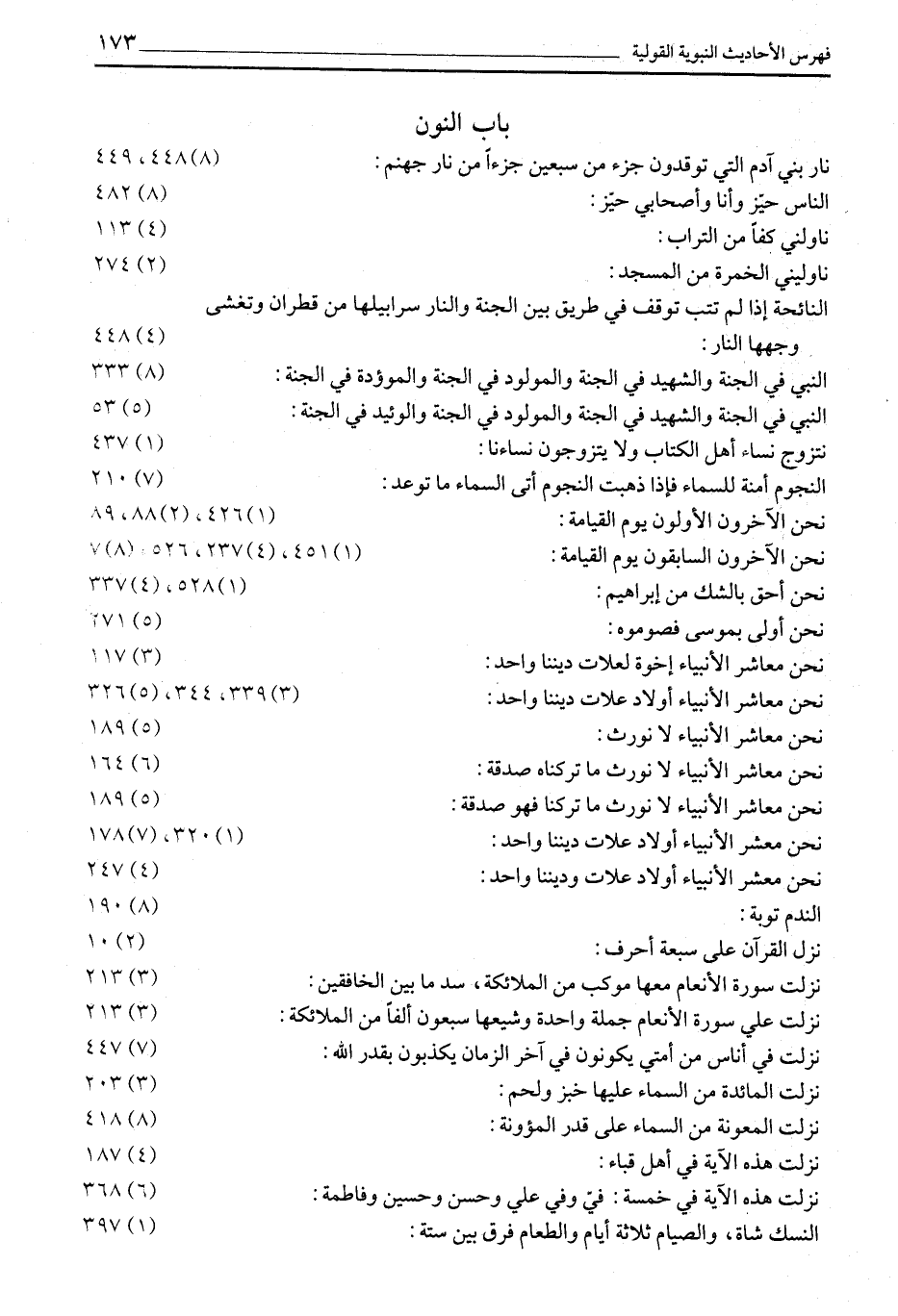 نَارُ بَنِي آدَمَ الَّتِي تُوقِدُونَ جُزْءٌ مِنْ سَبْعِينَ جُزْءًا مِنْ نَارِ جَهَنَّمَ: (8) 448، 449 الناس حيّز وأنا وأصحابي حيّز: (8) 482 ناولني كفا من التراب: (4) 113 ناوليني الخمرة من المسجد: (2) 274 النَّائِحَةُ إِذَا لَمْ تَتُبْ تُوقَفُ فِي طَرِيقٍ بين الجنة والنار سرابيلها من قطران وتغشى وجهها النار: (4) 448 النَّبِيُّ فِي الْجَنَّةِ وَالشَّهِيدُ فِي الْجَنَّةِ وَالْمَوْلُودُ في الجنة والموؤدة في الجنة: (8) 333 النَّبِيُّ فِي الْجَنَّةِ وَالشَّهِيدُ فِي الْجَنَّةِ وَالْمَوْلُودُ في الجنة والوئيد في الجنة: (5) 53 نَتَزَوَّجُ نِسَاءَ أَهْلِ الْكِتَابِ وَلَا يَتَزَوَّجُونَ نِسَاءَنَا: (1) 437 النُّجُومُ أَمَنَةٌ لِلسَّمَاءِ فَإِذَا ذَهَبَتِ النُّجُومُ أَتَى السماء ما توعد: (7) 210 نحن الآخرون الأولون يوم القيامة: (1) 426، (2) 88، 89 نحن الآخرون السابقون يوم القيامة: (1) 451، (4) 237، 526، (8) 7 نحن أحق بالشك من إبراهيم: (1) 528، (4) 337 نحن أولى بموسى فصوموه: (5) 271 نَحْنُ مُعَاشِرَ الْأَنْبِيَاءِ إِخْوَةٌ لِعَلَّاتٍ دِينُنَا وَاحِدٌ: (3) 117 نَحْنُ مَعَاشِرَ الْأَنْبِيَاءِ أَوْلَادُ عَلَّاتٍ دِينُنَا وَاحِدٌ: (3) 339، 344، (5) 326 نحن معاشر الأنبياء لا نورث: (5) 189 نحن معاشر الأنبياء لا نورث ما تركناه صدقة: (6) 164 نَحْنُ مُعَاشِرَ الْأَنْبِيَاءِ لَا نُورَثُ مَا تَرَكَنَا فهو صدقة: (5) 189 نَحْنُ مَعْشَرَ الْأَنْبِيَاءِ أَوْلَادُ عَلَّاتٍ دِينُنَا وَاحِدٌ: (1) 320، (7) 178 نحن معشر الأنبياء أولاد علات وديننا واحد: (4) 247 الندم توبة: (8) 190 نزل القرآن على سبعة أحرف: (2) 10 نَزَلَتْ سُورَةُ الْأَنْعَامِ مَعَهَا مَوْكِبٌ مِنَ الْمَلَائِكَةِ، سد ما بين الخافقين: (3) 213 نَزَلَتْ عَلَيَّ سُورَةُ الْأَنْعَامِ جُمْلَةً وَاحِدَةً وَشَيَّعَهَا سبعون ألفا من الملائكة: (3) 213 نَزَلَتْ فِي أُنَاسٍ مِنْ أُمَّتِي يَكُونُونَ فِي آخر الزمان يكذبون بقدر الله: (7) 447 نَزَلَتِ الْمَائِدَةُ مِنَ السَّمَاءِ عَلَيْهَا خُبْزٌ وَلَحْمٌ: (3) 203 نزلت المعونة من السماء على قدر المؤونة: (8) 418 نزلت هذه الآية في أهل قباء: (4) 187 نَزَلَتْ هَذِهِ الْآيَةُ فِي خَمْسَةٍ: فِيَّ وَفِي علي وحسن وحسين وفاطمة: (6) 368 النُّسُكُ شَاةٌ، وَالصِّيَامُ ثَلَاثَةُ أَيَّامِ وَالطَّعَامُ فَرَقٌ بين ستة: (1) 397