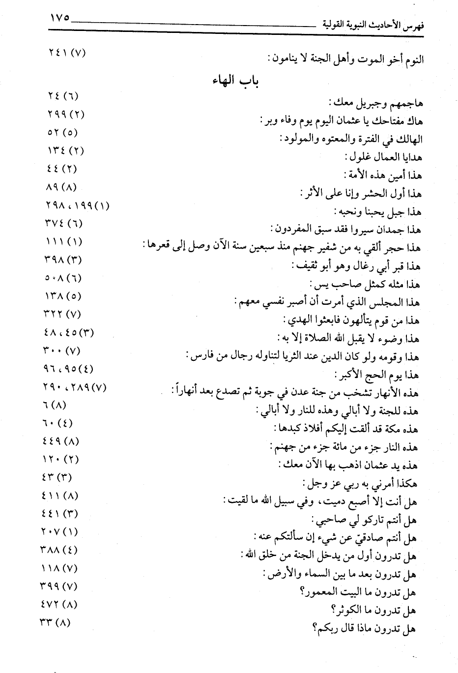 هاجمهم وجبريل معك: (6) 24 هَاكَ مِفْتَاحَكَ يَا عُثْمَانُ الْيَوْمُ يَوْمُ وَفَاءٍ وبر: (2) 299 الهالك في الفترة والمعتوه والمولود: (5) 52 هدايا العمال غلول: (2) 134 هذا أمين هذه الأمة: (2) 44 هذا أول الحشر وإنا على الأثر: (8) 89 هذا جبل يحبنا ونحبه: (1) 199، 298 هذا جمدان سيروا فقد سبق المفردون: (6) 374 هَذَا حَجَرٌ أُلْقِيَ بِهِ مِنْ شَفِيرِ جَهَنَّمَ مُنْذُ سَبْعِينَ سَنَةً الْآنَ وَصَلَ إِلَى قَعْرِهَا: (1) 111 هَذَا قَبْرُ أَبِي رِغَالٍ وَهُوَ أَبُو ثَقِيفٍ: (3) 398 هذا مثله كمثل صاحب يس: (6) 508 هَذَا الْمَجْلِسُ الَّذِي أُمِرْتُ أَنْ أُصَبِّرَ نَفْسِي معهم: (5) 138 هذا من قوم يتألهون فابعثوا الهدي: (7) 322 هَذَا وُضُوءٌ لَا يَقْبَلُ اللَّهُ الصَّلَاةَ إِلَّا به: (3) 45، 48 هَذَا وَقَوْمُهُ وَلَوْ كَانَ الدِّينُ عِنْدَ الثُّرَيَّا لتناوله رجال من فارس: (7) 300 هذا يوم الحج الأكبر: (4) 95، 96 هَذِهِ الْأَنْهَارُ تَشْخُبُ مِنْ جَنَّةِ عَدْنٍ فِي جوبة ثم تصدع بعد أنهارا: (7) 289، 290 هَذِهِ لِلْجَنَّةِ وَلَا أُبَالِي وَهَذِهِ لِلنَّارِ وَلَا أبالي: (8) 6 هَذِهِ مَكَّةُ قَدْ أَلْقَتْ إِلَيْكُمْ أَفْلَاذَ كَبِدِهَا: (4) 60 هَذِهِ النَّارُ جُزْءٌ مِنْ مِائَةِ جُزْءٍ مِنْ جهنم: (8) 449 هِذِهِ يَدُ عُثْمَانَ اذْهَبْ بِهَا الْآنَ مَعَكَ: (2) 120 هكذا أمرني به ربي عز وجل: (3) 43 هَلْ أَنْتِ إِلَّا إِصْبَعٌ دَمِيتِ، وَفِي سَبِيلِ الله ما لقيت: (8) 411 هل أنتم تاركو لي صاحبي: (3) 441 هَلْ أَنْتُمْ صَادِقِيَّ عَنْ شَيْءٍ إِنْ سَأَلْتُكُمْ عنه: (1) 207 هَلْ تَدْرُونَ أَوَّلَ مَنْ يَدْخُلُ الْجَنَّةَ مِنْ خلق الله: (4) 388 هَلْ تَدْرُونَ بُعْدَ مَا بَيْنَ السَّمَاءِ وَالْأَرْضِ: (7) 118 هل تدرون ما البيت المعمور؟ (7) 399 هل تدرون ما الكوثر؟ (8) 472 هل تدرون ماذا قال ربكم؟ (8) 33