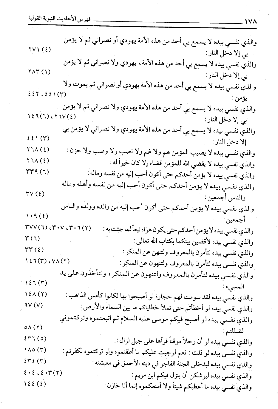 وَالَّذِي نَفْسِي بِيَدِهِ لَا يَسْمَعُ بِي أَحَدٌ مِنْ هَذِهِ الْأُمَّةِ يَهُودِيٌّ أَوْ نَصْرَانِيٌّ ثُمَّ لَا يُؤْمِنُ بِي إِلَّا دَخَلَ النار: (4) 271 وَالَّذِي نَفْسِي بِيَدِهِ لَا يَسْمَعُ بِي أَحَدٌ مِنْ هَذِهِ الْأُمَّةِ، يَهُودِيٌّ وَلَا نَصْرَانِيٌّ ثُمَّ لا يؤمن بي إلا دخل النار: (1) 283 وَالَّذِي نَفْسِي بِيَدِهِ لَا يَسْمَعُ بِي أَحَدٌ مِنْ هَذِهِ الْأُمَّةِ يَهُودِيٌّ أَوْ نَصْرَانِيٌّ ثُمَّ يموت ولا يؤمن: (3) 441، 442 وَالَّذِي نَفْسِي بِيَدِهِ لَا يَسْمَعُ بِي أَحَدٌ مِنْ هَذِهِ الْأُمَّةِ يَهُودِيٌّ وَلَا نَصْرَانِيٌّ ثُمَّ لا يؤمن بي إلا دخل النار: (4) 267، (6) 149 وَالَّذِي نَفْسِي بِيَدِهِ لَا يَسْمَعُ بِي أَحَدٌ من هذه الأمة يهودي ولا نصراني لا يؤمن بي إلا دخل النار: (3) 441 وَالَّذِي نَفْسِي بِيَدِهِ لَا يُصِيبُ الْمُؤْمِنَ هَمٌّ وَلَا غَمٌّ وَلَا نَصَبٌ وَلَا وَصَبٌ وَلَا حزن: (4) 268 وَالَّذِي نَفْسِي بِيَدِهِ لَا يَقْضِي اللَّهُ لِلْمُؤْمِنِ قضاء إلا كان خيرا له: (4) 268 وَالَّذِي نَفْسِي بِيَدِهِ لَا يُؤْمِنُ أَحَدُكُمْ حَتَّى أكون أحب إليه من نفسه وماله: (6) 339 وَالَّذِي نَفْسِي بِيَدِهِ لَا يُؤْمِنُ أَحَدُكُمْ حَتَّى أَكُونَ أَحَبَّ إِلَيْهِ مِنْ نَفْسِهِ وَأَهْلِهِ وَمَالِهِ والناس أجمعين: (4) 37 وَالَّذِي نَفْسِي بِيَدِهِ لَا يُؤْمِنُ أَحَدُكُمْ حَتَّى أَكُونَ أَحَبَّ إِلَيْهِ مِنْ وَالِدِهِ وَوَلَدِهِ وَالنَّاسِ أجمعين: (4) 109 وَالَّذِي نَفْسِي بِيَدِهِ لَا يُؤْمِنُ أَحَدُكُمْ حَتَّى يكون هواه تبعا لما جئت به: (2) 306، 307، (6) 377 وَالَّذِي نَفْسِي بِيَدِهِ لَأَقْضِيَنَّ بَيْنَكُمَا بِكِتَابِ اللَّهِ تعالى: (6) 3 والذي نفسي بيده لتأمرن بالمعروف ولتنهن عن المنكر: (4) 33 وَالَّذِي نَفْسِي بِيَدِهِ لَتَأْمُرُنَّ بِالْمَعْرُوفِ وَلَتَنْهَوُنَّ عَنِ المنكر: (2) 78، (3) 146 وَالَّذِي نَفْسِي بِيَدِهِ لَتَأْمُرُنَّ بِالْمَعْرُوفِ وَلَتَنْهَوُنَّ عَنِ المنكر، ولتأخذون على يد المسيء: (3) 146 وَالَّذِي نَفْسِي بِيَدِهِ لَقَدْ سُوِّمَتْ لَهُمْ حِجَارَةٌ لو أصبحوا بها لكانوا كأمس الذاهب: (2) 148 وَالَّذِي نَفْسِي بِيَدِهِ لَوْ أَخْطَأْتُمْ حَتَّى تَمْلَأَ خطاياكم ما بين السماء والأرض: (7) 97 والذي نفسي بِيَدِهِ لَوْ أَصْبَحَ فِيكُمْ مُوسَى عَلَيْهِ السَّلَامُ ثم اتبعتموه وتركتموني لضللتم: (2) 58 وَالَّذِي نَفْسِي بِيَدِهِ لَوْ أَنَّ رَجُلًا مُوقِنًا قرأها على جبل لزال: (5) 436 وَالَّذِي نَفْسِي بِيَدِهِ لَوْ قُلْتُ: نَعَمْ لَوَجَبَتْ عليكم ما أطقتموه ولو تركتموه لكفرتم: (3) 185 وَالَّذِي نَفْسِي بِيَدِهِ لَيَدْخُلَنَّ الْجَنَّةَ الْفَاجِرُ فِي دِينِهِ الْأَحْمَقُ فِي مَعِيشَتِهِ: (3) 434 وَالَّذِي نَفْسِي بِيَدِهِ ليوشكن أن ينزل فيكم ابن مريم: (2) 403، 404 وَالَّذِي نَفْسِي بِيَدِهِ مَا أُعْطِيكُمْ شَيْئًا وَلَا أمنعكموه إنما أنا خازن: (4) 144