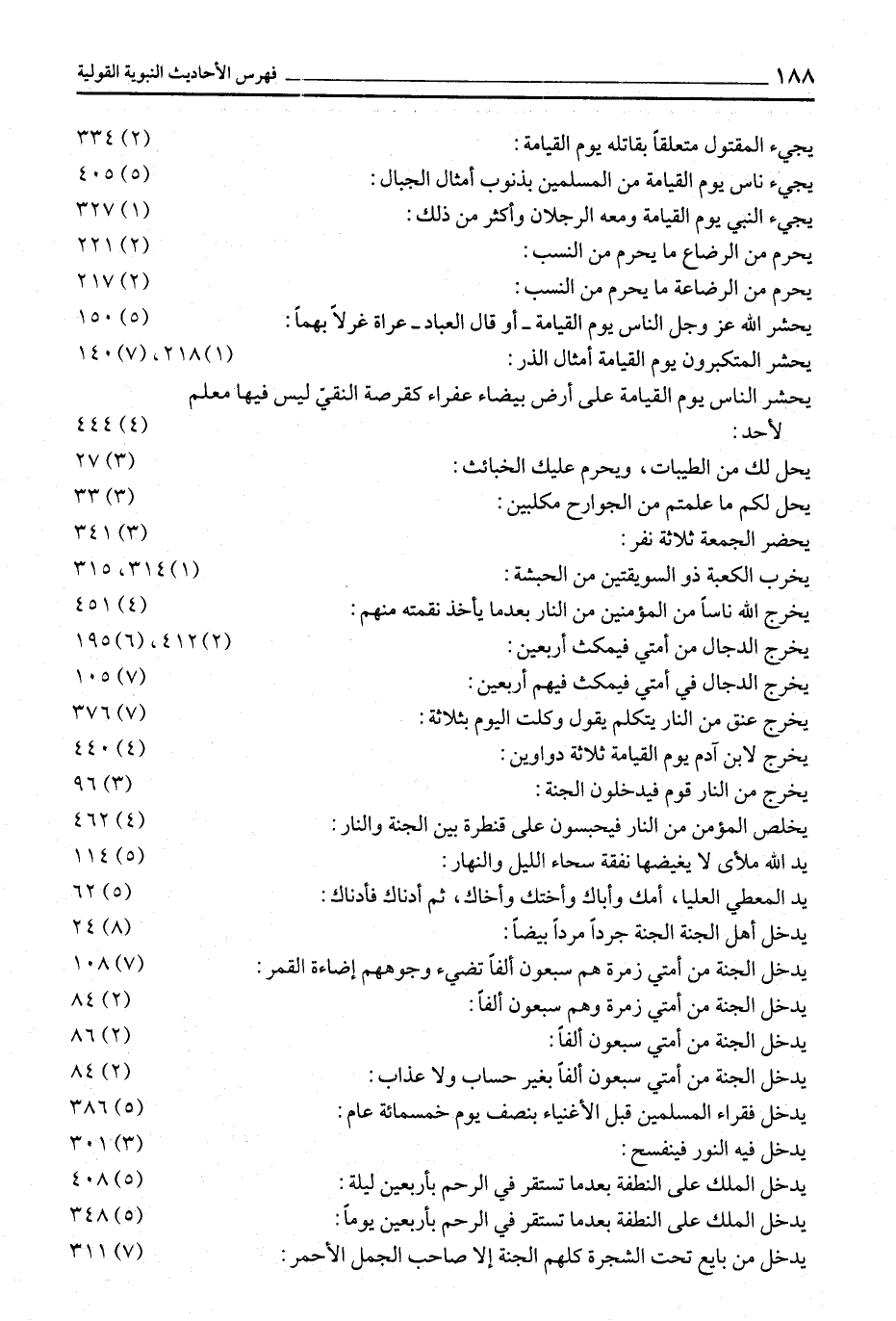 : (3) 341 يخرب الكعبة ذو السويقتين من الحبشة: (1) 314، 315 يُخْرِجُ اللَّهُ نَاسًا مِنَ الْمُؤْمِنِينَ مِنَ النَّارِ بعد ما يأخذ نقمته منهم: (4) 451 يخرج الدجال من أمتي فيمكث أربعين: (2) 412، (6) 195 يَخْرُجُ الدَّجَّالُ فِي أُمَّتِي فَيَمْكُثُ فِيهِمْ أَرْبَعِينَ: (7) 105 يَخْرُجُ عُنُقٌ مِنَ النَّارِ يَتَكَلَّمُ يَقُولُ وُكِّلْتُ اليوم بثلاثة: (7) 376 يَخْرُجُ لِابْنِ آدَمَ يَوْمَ الْقِيَامَةِ ثَلَاثَةُ دَوَاوِينَ: (4) 440 يخرج من النار قوم فيدخلون الجنة: (3) 96 يخلص المؤمن مِنَ النَّارِ فَيُحْبَسُونَ عَلَى قَنْطَرَةٍ بَيْنَ الْجَنَّةِ والنار: (4) 462 يَدُ اللَّهِ مَلْأَى لَا يَغِيضُهَا نَفَقَةٌ سَحَّاءُ اللَّيْلِ والنهار: (5) 114 يَدُ الْمُعْطِي الْعُلْيَا، أُمَّكَ وَأَبَاكَ وَأُخْتَكَ وَأَخَاكَ، ثم أدناك فأدناك: (5) 62 يَدْخُلُ أَهْلُ الْجَنَّةِ الْجَنَّةَ جُرْدًا مُرْدًا بِيضًا: (8) 24 يَدْخُلُ الْجَنَّةَ مِنْ أُمَّتِي زُمْرَةٌ هُمْ سَبْعُونَ ألفا تضيء وجوههم إضاءة القمر: (7) 108 يَدْخُلُ الْجَنَّةَ مِنْ أُمَّتِي زُمْرَةٌ وَهُمْ سَبْعُونَ ألفا: (2) 84 يدخل الجنة من أمتي سبعون ألفا: (2) 86 يَدْخُلُ الْجَنَّةَ مِنْ أُمَّتِي سَبْعُونَ أَلْفًا بِغَيْرِ حساب ولا عذاب: (2) 84 يدخل فقراء المسلمين قبل الأغنياء بنصف يوم خمسمائة عام: (5) 386 يدخل فيه النور فينفسح: (3) 301 يَدْخُلُ الْمَلَكُ عَلَى النُّطْفَةِ بَعْدَ مَا تَسْتَقِرُّ في الرحم بأربعين ليلة: (5) 408 يَدْخُلُ الْمَلَكُ عَلَى النُّطْفَةِ بَعْدَ مَا تَسْتَقِرُّ في الرحم بأربعين يوما: (5) 348 يَدْخُلُ مَنْ بَايَعَ تَحْتَ الشَّجَرَةِ كُلُّهُمُ الْجَنَّةَ إلا صاحب الجمل الأحمر: (7) 311