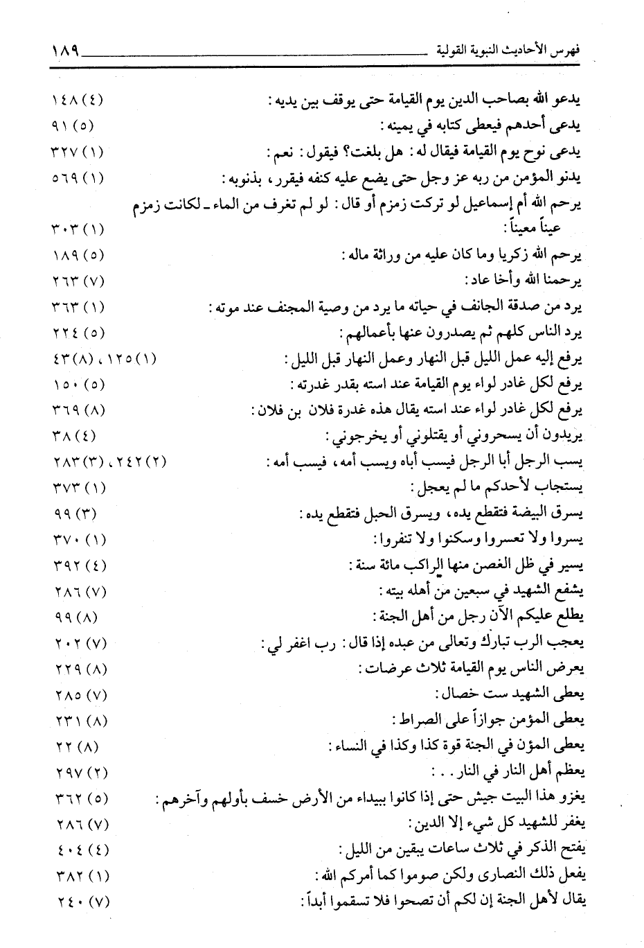 يَدْعُو اللَّهُ بِصَاحِبِ الدَّيْنِ يَوْمَ الْقِيَامَةِ حَتَّى يوقف بين يديه: (4) 148 يدعى أحدهم فيعطى كتابه في يمينه: (5) 91 يُدْعَى نُوحٌ يَوْمَ الْقِيَامَةِ فَيُقَالُ لَهُ: هَلْ بلغت؟ فيقول: نعم: (1) 327 يَدْنُو الْمُؤْمِنُ مِنْ رَبِّهِ عَزَّ وَجَلَّ حَتَّى يضع عليه كنفه فيقرر، بذنوبه: (1) 569 يَرْحَمُ اللَّهُ أَمَّ إِسْمَاعِيلَ لَوْ تَرَكَتْ زَمْزَمَ أَوْ قَالَ: لَوْ لَمْ تَغْرِفْ مِنَ الْمَاءِ- لكانت زمزم عينا معينا: (1) 303 يَرْحَمُ اللَّهُ زَكَرِيَّا وَمَا كَانَ عَلَيْهِ مِنْ وراثة ماله: (5) 189 يرحمنا الله وأخا عاد: (7) 263 يرد من صدقة الجانف فِي حَيَاتِهِ مَا يُرَدُّ مِنْ وَصِيَّةِ الْمُجْنِفِ عند موته: (1) 363 يرد الناس كلهم ثم يصدرون عنها بأعمالهم: (5) 224 يُرْفَعُ إِلَيْهِ عَمَلُ اللَّيْلِ قَبْلَ النَّهَارِ وَعَمَلُ النهار قبل الليل: (1) 125، (8) 43 يُرْفَعُ لِكُلِّ غَادِرٍ لِوَاءٌ يَوْمَ الْقِيَامَةِ عِنْدَ استه بقدر غدرته: (5) 150 يُرْفَعُ لِكُلِّ غَادِرٍ لِوَاءٌ عِنْدَ اسْتِهِ يُقَالُ هذه غدرة فلان بن فلان: (8) 369 يُرِيدُونَ أَنْ يَسْحَرُونِي أَوْ يَقْتُلُونِي أَوْ يُخْرِجُونِي: (4) 38 يَسُبُّ الرَّجُلُ أَبَا الرَّجُلِ فَيَسُبُّ أَبَاهُ وَيَسُبُّ أمه، فيسب أمه: (2) 242، (3) 283 يستجاب لأحدكم ما لم يعجل: (1) 373 يَسْرِقُ الْبَيْضَةَ فَتُقْطَعُ يَدُهُ، وَيَسْرِقُ الْحَبْلَ فَتُقْطَعُ يده: (3) 99 يسروا ولا تعسروا وسكنوا ولا تنفروا: (1) 370 يسير في ظل الغصن منها الراكب مائة سنة: (4) 392 يشفع الشهيد في سبعين من أهله بيته: (7) 286 يطلع عليكم الآن رجل من أهل الجنة: (8) 99 يعجب الرب تبارك وتعالى مِنْ عَبْدِهِ إِذَا قَالَ: رَبِّ اغْفِرْ لِي: (7) 202 يعرض الناس يوم القيامة ثلاث عرضات: (8) 229 يعطى الشهيد ست خصال: (7) 285 يعطى المؤمن جوازا على الصراط: (8) 231 يُعْطَى الْمُؤْمِنُ فِي الْجَنَّةِ قُوَّةَ كَذَا وَكَذَا في النساء: (8) 22 يعظم أهل النار في النار..: (2) 297