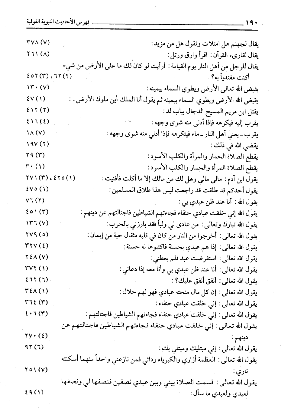 يُقَالُ لِجَهَنَّمَ هَلِ امْتَلَأْتِ وَتَقُولُ هَلْ مِنْ مزيد: (7) 378 يقال لقارئ القرآن: اقرأ وارق ورتل: (8) 261 يُقَالُ لِلرَّجُلِ مِنْ أَهْلِ النَّارِ يَوْمَ الْقِيَامَةِ: أَرَأَيْتَ لَوْ كَانَ لَكَ مَا عَلَى الْأَرْضِ من شيء أكنت مفتديا به؟ (2) 62، (3) 452 يقبض الله تعالى الأرض ويطوي السماء بيمينه: (7) 130 يَقْبِضُ اللَّهُ الْأَرْضَ وَيَطْوِي السَّمَاءَ بِيَمِينِهِ ثُمَّ يقول أنا الملك أين ملوك الأرض.: (1) 47