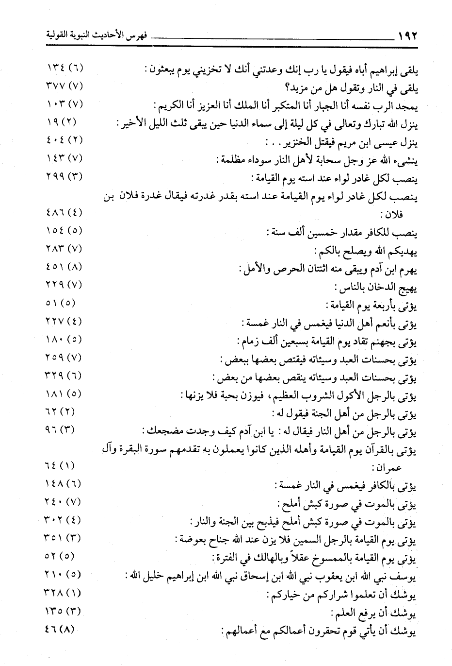 يَلْقَى إِبْرَاهِيمُ أَبَاهُ فَيَقُولُ يَا رَبِّ إِنَّكَ وعدتني أنك لا تخزيني يوم يبعثون: (6) 134 يُلْقَى فِي النَّارِ وَتَقُولُ هَلْ مِنْ مَزِيدٍ؟ (7) 377 يُمَجِّدُ الرَّبُّ نَفْسَهُ أَنَا الْجَبَّارُ أَنَا الْمُتَكَبِّرُ أنا الملك أنا العزيز أنا الكريم: (7) 103 يَنْزِلُ اللَّهُ تَبَارَكَ وَتَعَالَى فِي كُلِّ لَيْلَةٍ إِلَى سَمَاءِ الدُّنْيَا حِينَ يَبْقَى ثُلُثُ اللَّيْلِ الأخير: (2) 19 ينزل عيسى ابن مريم فيقتل الخنزير..: (2) 404