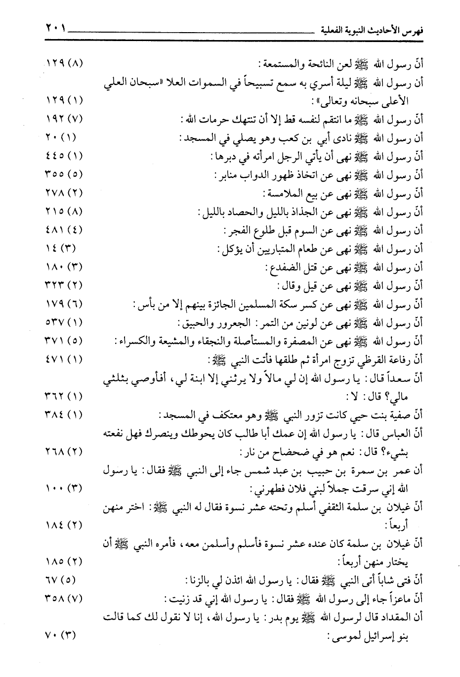 أن رسول الله صلى الله عليه وسلم لعن النائحة والمستمعة: (8) 129 أن رسول الله صلى الله عليه وسلم ليلة أسري به سمع تسبيحا في السموات العلا «سبحان العلي الأعلى سبحانه وتعالى» : (1) 129 أن رسول الله صلى الله عليه وسلم مَا انْتَقَمَ لِنَفْسِهِ قَطُّ إِلَّا أَنْ تُنْتَهَكَ حرمات اللَّهِ: (7) 192 أَنَّ رَسُولَ اللَّهِ صَلَّى اللَّهُ عَلَيْهِ وَسَلَّمَ نَادَى أُبَيَّ بْنَ كَعْبٍ وَهُوَ يُصَلِّي في المسجد: (1) 20 أن رسول الله صلى الله عليه وسلم نَهَى أَنْ يَأْتِيَ الرَّجُلُ امْرَأَتَهُ فِي دُبُرِهَا: (1) 445 أن رسول الله صلى الله عليه وسلم نهى عن اتخاذ ظهور الدواب منابر: (5) 355 أن رسول الله صلى الله عليه وسلم نهى عن بيع الملامسة: (2) 278 أن رسول الله صلى الله عليه وسلم نهى عن الجذاذ بالليل والحصاد بالليل: (8) 215 أن رسول الله صلى الله عليه وسلم نهى عن السوم قبل طلوع الفجر: (4) 481 أن رسول الله صلى الله عليه وسلم نهى عن طعام المتباريين أن يؤكل: (3) 14 أن رسول الله صلى الله عليه وسلم نهى عن قتل الضفدع: (3) 180 أن رسول الله صلى الله عليه وسلم نهى عن قيل وَقَالَ: (2) 323 إِنَّ رَسُولَ اللَّهِ صَلَّى اللَّهُ عَلَيْهِ وسلم نَهَى عَنْ كَسْرِ سِكَّةِ الْمُسْلِمِينَ الْجَائِزَةِ بَيْنَهُمْ إلا من بأس: (6) 179 أن رسول الله صلى الله عليه وسلم نهى عن لونين من التمر: الجعرور والحبيق: (1) 537 أن رسول الله صلى الله عليه وسلم نهى عن المصفرة والمستأصلة والنجقاء والمشيعة والكسراء: (5) 371 أَنَّ رِفَاعَةَ الْقُرَظِيَّ تَزَوَّجَ امْرَأَةً ثُمَّ طَلَّقَهَا فأتت النبي صلّى الله عليه وسلّم: (1) 471 أَنَّ سَعْدًا قَالَ: يَا رَسُولَ اللَّهِ إِنَّ لِي مَالًا وَلَا يَرِثُنِي إِلَّا ابْنَةٌ لِي، أفأوصي بثلثي مالي؟ قال: لا: (1) 362 أَنَّ صَفِيَّةَ بِنْتَ حُيَيٍّ كَانَتْ تَزُورُ النَّبِيَّ صَلَّى اللَّهُ عَلَيْهِ وَسَلَّمَ وَهُوَ مُعْتَكَفٌ فِي المسجد: (1) 384 أَنَّ الْعَبَّاسَ قَالَ: يَا رَسُولَ اللَّهِ إِنْ عمك أَبَا طَالِبٍ كَانَ يَحُوطُكَ وَيَنْصُرُكَ فَهَلْ نَفَعْتَهُ بِشَيْءٍ؟ قَالَ: نَعَمْ هُوَ فِي ضَحْضَاحٍ مِنْ نار: (2) 268 أنّ عمر بْنَ سَمُرَةَ بْنِ حَبِيبِ بْنِ عَبْدِ شَمْسٍ جَاءَ إِلَى النَّبِيِّ صَلَّى اللَّهُ عَلَيْهِ وَسَلَّمَ فَقَالَ: يَا رَسُولَ اللَّهِ إِنِّي سَرَقْتُ جَمَلًا لبني فلان فطهرني: (3) 100 أَنَّ غَيْلَانَ بْنَ سَلَمَةَ الثَّقَفِيَّ أَسْلَمَ وَتَحْتَهُ عشر نِسْوَةٍ فَقَالَ لَهُ النَّبِيُّ صَلَّى اللَّهُ عَلَيْهِ وَسَلَّمَ: اختر منهن أربعا: (2) 184 أَنَّ غَيْلَانَ بْنَ سَلَمَةَ كَانَ عِنْدَهُ عَشْرُ نِسْوَةٍ فَأَسْلَمَ وَأَسْلَمْنَ مَعَهُ، فَأَمَرَهُ النَّبِيُّ صَلَّى اللَّهُ عَلَيْهِ وَسَلَّمَ أَنْ يَخْتَارَ مِنْهُنَّ أَرْبَعًا: (2) 185 إِنَّ فَتًى شَابًّا أَتَى النَّبِيَّ صَلَّى اللَّهُ عَلَيْهِ وَسَلَّمَ فَقَالَ: يَا رَسُولَ اللَّهِ ائْذَنْ لي بالزنا: (5) 67 أنّ ما عزا جَاءَ إِلَى رَسُولِ اللَّهِ صَلَّى اللَّهُ عَلَيْهِ وَسَلَّمَ فَقَالَ: يَا رَسُولَ اللَّهِ إِنِّي قَدْ زنيت: (7) 358 أَنَّ الْمِقْدَادَ قَالَ لِرَسُولِ اللَّهِ صَلَّى اللَّهُ عَلَيْهِ وَسَلَّمَ يَوْمَ بِدْرٍ: يَا رَسُولَ اللَّهِ، إِنَّا لَا نَقُولُ لَكَ كَمَا قَالَتْ بَنُو إسرائيل لموسى: (3) 70