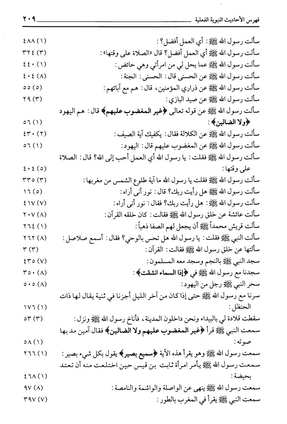 سَأَلْتُ رَسُولَ اللَّهِ صَلَّى اللَّهُ عَلَيْهِ وَسَلَّمَ: أي العمل أفضل؟: (1) 488 سَأَلْتُ رَسُولَ اللَّهِ صَلَّى اللَّهُ عَلَيْهِ وَسَلَّمَ أَيُّ الْعَمَلِ أَفْضَلُ؟ قَالَ «الصَّلَاةُ عَلَى وَقْتِهَا» : (3) 324 سَأَلْتُ رَسُولَ اللَّهِ صَلَّى اللَّهُ عَلَيْهِ وَسَلَّمَ عَمَّا يَحِلُّ لِي مِنَ امْرَأَتِي وَهِيَ حَائِضٌ: (1) 440 سَأَلْتُ رَسُولَ اللَّهِ صَلَّى اللَّهُ عَلَيْهِ وَسَلَّمَ عن الحسنى قال: الحسنى: الجنة: (8) 404 سَأَلْتُ رَسُولَ اللَّهِ صَلَّى اللَّهُ عَلَيْهِ وَسَلَّمَ عن ذراري المؤمنين، قال: هم مع آبائهم: (5) 55 سَأَلْتُ رَسُولَ اللَّهِ صَلَّى اللَّهُ عَلَيْهِ وَسَلَّمَ عن صيد البازي: (3) 29 سَأَلْتُ رَسُولَ اللَّهِ صَلَّى اللَّهُ عَلَيْهِ وَسَلَّمَ عن قوله تعالى غَيْرِ الْمَغْضُوبِ عَلَيْهِمْ قَالَ: هُمُ الْيَهُودُ وَلَا الضَّالِّينَ: (1) 56 سَأَلْتُ رَسُولَ اللَّهِ صَلَّى اللَّهُ عَلَيْهِ وَسَلَّمَ عن الكلالة فقال: يكفيك آية الصيف: (2) 430 سَأَلْتُ رَسُولَ اللَّهِ صَلَّى اللَّهُ عَلَيْهِ وَسَلَّمَ عن المغضوب عليهم قال: اليهود: (1) 56 سَأَلْتُ رَسُولَ اللَّهِ صَلَّى اللَّهُ عَلَيْهِ وَسَلَّمَ فَقَلَتْ: يَا رَسُولَ اللَّهِ أَيُّ الْعَمَلِ أَحَبُّ إِلَى اللَّهِ؟ قَالَ: الصَّلَاةُ على وقتها: (5) 404 سَأَلْتُ رَسُولَ اللَّهِ صَلَّى اللَّهُ عَلَيْهِ وَسَلَّمَ فَقُلْتُ يَا رَسُولَ اللَّهِ مَا آيَةُ طُلُوعِ الشمس من مغربها: (3) 335 سَأَلْتُ رَسُولَ اللَّهِ صَلَّى اللَّهُ عَلَيْهِ وَسَلَّمَ هل رأيت ربك؟ قال: نور أنى أراه: (5) 16 سَأَلْتُ رَسُولَ اللَّهِ صَلَّى اللَّهُ عَلَيْهِ وَسَلَّمَ: هَلْ رَأَيْتَ رَبَّكَ؟ فَقَالَ: نُورٌ أَنَّى أَرَاهُ: (7) 417 سَأَلْتُ عَائِشَةَ عَنْ خُلُقِ رَسُولِ اللَّهِ صَلَّى اللَّهُ عَلَيْهِ وَسَلَّمَ فَقَالَتْ: كَانَ خُلُقُهُ الْقُرْآنَ: (8) 207 سَأَلَتْ قُرَيْشٌ مُحَمَّدًا صَلَّى اللَّهُ عَلَيْهِ وَسَلَّمَ أَنْ يَجْعَلَ لَهُمُ الصفا ذهبا: (1) 264 سَأَلْتُ النَّبِيَّ صَلَّى اللَّهُ عَلَيْهِ وَسَلَّمَ فَقُلْتُ: يَا رَسُولَ اللَّهِ هَلْ تُحِسُّ بِالْوَحْيِ؟ فَقَالَ: أسمع صلاصل: (8) 262 سألتها عَنْ خُلُقِ رَسُولِ اللَّهِ صَلَّى اللَّهُ عَلَيْهِ وَسَلَّمَ فقالت: القرآن: (3) 3 سَجَدَ النَّبِيُّ صَلَّى اللَّهُ عَلَيْهِ وَسَلَّمَ بِالنَّجْمِ وسجد معه المسلمون: (7) 435 سَجَدْنَا مَعَ رَسُولِ اللَّهِ صَلَّى اللَّهُ عَلَيْهِ وَسَلَّمَ في إِذَا السَّماءُ انْشَقَّتْ: (8) 350 سَحَرَ النَّبِيَّ صَلَّى اللَّهُ عَلَيْهِ وَسَلَّمَ رَجُلٌ مَنْ اليهود: (8) 505 سِرْنَا مَعَ رَسُولِ اللَّهِ صَلَّى اللَّهُ عَلَيْهِ وَسَلَّمَ حَتَّى إِذَا كَانَ مِنْ آخِرِ اللَّيْلِ أَجَزْنَا فِي ثَنِيَّةٍ يُقَالُ لَهَا ذَاتُ الْحَنْظَلِ: (1) 176 سَقَطَتْ قِلَادَةٌ لِي بِالْبَيْدَاءِ وَنَحْنُ دَاخِلُونَ الْمَدِينَةَ، فَأَنَاخَ رَسُولُ اللَّهِ صَلَّى اللَّهُ عَلَيْهِ وَسَلَّمَ ونزل: (3) 53 سَمِعْتُ النَّبِيَّ صَلَّى اللَّهُ عَلَيْهِ وَسَلَّمَ قَرَأَ غَيْرِ الْمَغْضُوبِ عَلَيْهِمْ وَلَا الضَّالِّينَ فَقَالَ آمِينَ مد بها صوته: (1) 58 سمعت رسول الله صلى الله عليه وسلم وهو يقرأ هَذِهِ الْآيَةِ سَمِيعٌ بَصِيرٌ يَقُولُ بِكُلِّ شَيْءٍ بصير: (1) 266 سمعت رسول الله صلى الله عليه وسلم يَأْمُرُ امْرَأَةَ ثَابِتِ بْنِ قَيْسٍ حِينَ اخْتَلَعَتْ منه أن تعتد بحيضة: (1) 468 سمعت رسول الله صلى الله عليه وسلم ينهى عن الواصلة والواشمة والنامصة: (8) 97 سَمِعْتُ النَّبِيُّ صَلَّى اللَّهُ عَلَيْهِ وَسَلَّمَ يَقْرَأُ فِي المغرب بالطور: (7) 397