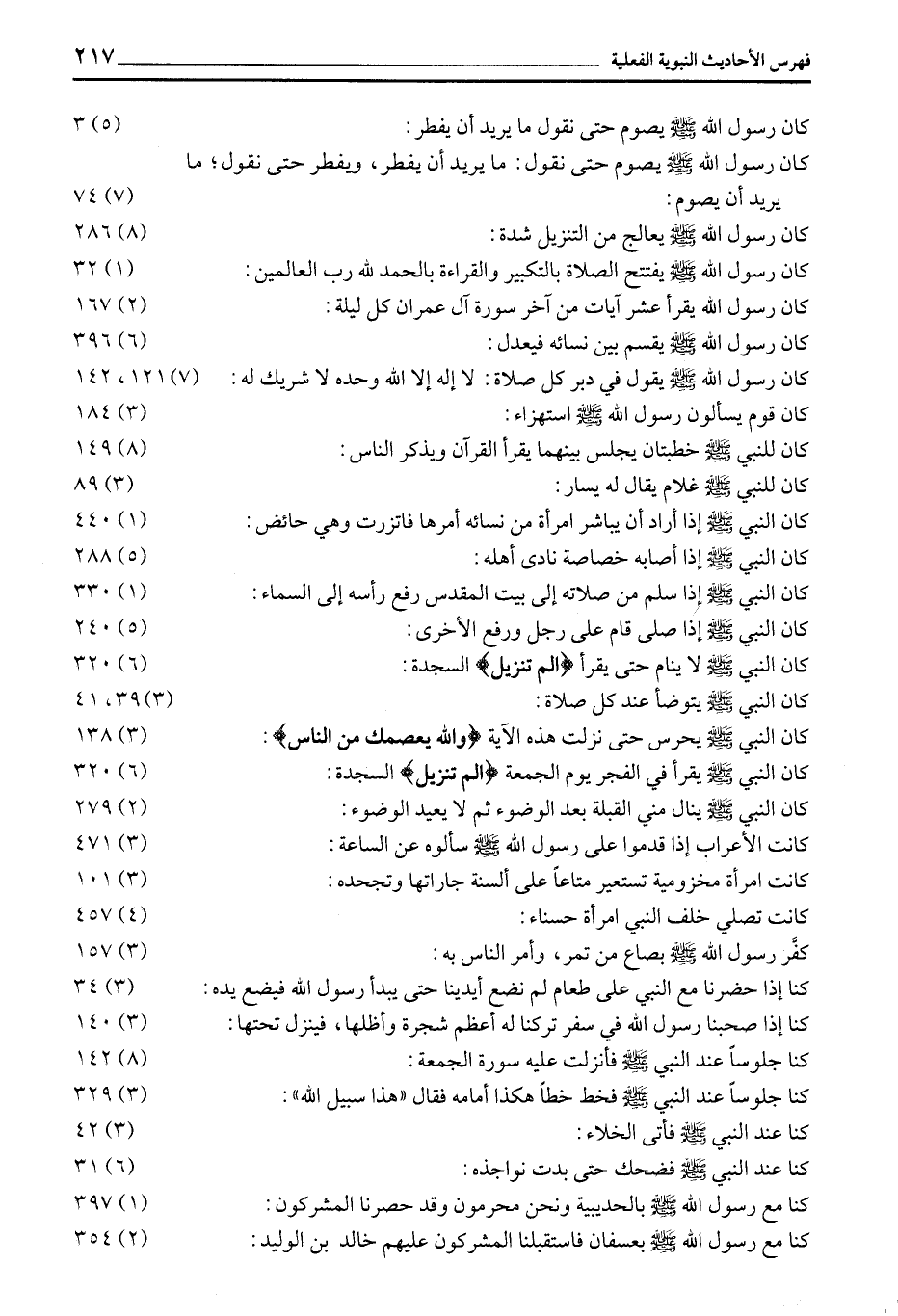 كَانَ رَسُولُ اللَّهِ صَلَّى اللَّهُ عَلَيْهِ وَسَلَّمَ يَصُومُ حَتَّى نَقُولَ مَا يُرِيدُ أَنْ يُفْطِرَ: (5) 3 كَانَ رَسُولُ اللَّهِ صَلَّى اللَّهُ عَلَيْهِ وَسَلَّمَ يَصُومُ حَتَّى نَقُولَ: مَا يُرِيدُ أَنْ يُفْطِرَ، وَيُفْطِرُ حَتَّى نَقُولَ مَا يُرِيدُ أَنْ يَصُومَ: (7) 74 كَانَ رَسُولُ اللَّهِ صَلَّى اللَّهُ عَلَيْهِ وَسَلَّمَ يعالج من التنزيل شدة: (8) 286 كَانَ رَسُولُ اللَّهِ صَلَّى اللَّهُ عَلَيْهِ وَسَلَّمَ يفتتح الصلاة بالتكبير والقراءة بالحمد لله رب العالمين: (1) 32 كَانَ رَسُولُ اللَّهِ صَلَّى اللَّهُ عَلَيْهِ وَسَلَّمَ يَقْرَأُ عَشْرَ آيَاتٍ مِنْ آخِرِ سُورَةِ آلِ عمران كل ليلة: (2) 167 كَانَ رَسُولُ اللَّهِ صَلَّى اللَّهُ عَلَيْهِ وَسَلَّمَ يقسم بين نسائه فيعدل: (6) 396 كَانَ رَسُولُ اللَّهِ صَلَّى اللَّهُ عَلَيْهِ وَسَلَّمَ يقول في دبر كل صلاة: لَا إِلَهَ إِلَّا اللَّهُ وَحْدَهُ لَا شَرِيكَ له: (7) 121، 142 كَانَ قَوْمٌ يَسْأَلُونَ رَسُولَ اللَّهِ صَلَّى اللَّهُ عليه وسلّم استهزاء: (3) 184 كان لِلنَّبِيِّ صَلَّى اللَّهُ عَلَيْهِ وَسَلَّمَ خُطْبَتَانِ يَجْلِسُ بينهما يقرأ القرآن ويذكر الناس: (8) 149 كَانَ لِلنَّبِيِّ صَلَّى اللَّهُ عَلَيْهِ وَسَلَّمَ غُلَامٌ يقال له يسار: (3) 89 كَانَ النَّبِيُّ صَلَّى اللَّهُ عَلَيْهِ وَسَلَّمَ إِذَا أَرَادَ أَنْ يُبَاشِرَ امْرَأَةً مِنْ نِسَائِهِ أَمَرَهَا فاتزرت وهي حائض: (1) 440 كَانَ النَّبِيُّ صَلَّى اللَّهُ عَلَيْهِ وَسَلَّمَ إِذَا أصابه خصاصة نادى أهله: (5) 288 كَانَ النَّبِيُّ صَلَّى اللَّهُ عَلَيْهِ وَسَلَّمَ إِذَا سَلَّمَ مِنْ صَلَاتِهِ إِلَى بَيْتِ الْمَقْدِسِ رَفَعَ رأسه إلى السماء: (1) 330 كَانَ النَّبِيُّ صَلَّى اللَّهُ عَلَيْهِ وَسَلَّمَ إِذَا صَلَّى قَامَ على رجل ورفع الأخرى: (5) 240 كَانَ النَّبِيُّ صَلَّى اللَّهُ عَلَيْهِ وَسَلَّمَ لَا ينام حتى يقرأ الم تَنْزِيلُ السجدة: (6) 320 كَانَ النَّبِيُّ صَلَّى اللَّهُ عَلَيْهِ وَسَلَّمَ يَتَوَضَّأُ عند كل صلاة: (3) 39، 41 كَانَ النَّبِيُّ صَلَّى اللَّهُ عَلَيْهِ وَسَلَّمَ يُحْرَسُ حَتَّى نَزَلَتْ هَذِهِ الْآيَةُ وَاللَّهُ يَعْصِمُكَ مِنَ النَّاسِ: (3) 138 كَانَ النَّبِيُّ صَلَّى اللَّهُ عَلَيْهِ وَسَلَّمَ يَقْرَأُ فِي الْفَجْرِ يَوْمَ الْجُمُعَةِ الم تَنْزِيلُ السَّجْدَةَ: (6) 320 كان النبي صَلَّى اللَّهُ عَلَيْهِ وَسَلَّمَ يَنَالُ مِنِّي الْقُبْلَةَ بعد الوضوء ثم لا يعيد الوضوء: (2) 279 كَانَتِ الْأَعْرَابُ إِذَا قَدِمُوا عَلَى رَسُولِ اللَّهِ صَلَّى اللَّهُ عَلَيْهِ وَسَلَّمَ سَأَلُوهُ عَنِ السَّاعَةِ: (3) 471 كَانَتِ امْرَأَةٌ مَخْزُومِيَّةٌ تَسْتَعِيرُ مَتَاعًا عَلَى أَلْسِنَةِ جاراتها وتجحده: (3) 101 كانت تصلّي خلف النبي امرأة حسناء: (4) 457 كَفَّرَ رَسُولُ اللَّهِ صَلَّى اللَّهُ عَلَيْهِ وَسَلَّمَ بصاع من تمر، وأمر الناس به: (3) 157 كنا إذا حضرنا مع النبي عَلَى طَعَامٍ لَمْ نَضَعْ أَيْدِيَنَا حَتَّى يَبْدَأَ رسول الله فيضع يده: (3) 34 كنا إذا صحبنا رسول الله فِي سَفَرٍ تَرَكْنَا لَهُ أَعْظَمَ شَجَرَةٍ وَأَظَلَّهَا، فينزل تحتها: (3) 140 كُنَّا جُلُوسًا عِنْدَ النَّبِيِّ صَلَّى اللَّهُ عَلَيْهِ وسلّم فأنزلت عليه سورة الجمعة: (8) 142 كُنَّا جُلُوسًا عِنْدَ النَّبِيِّ صَلَّى اللَّهُ عَلَيْهِ وَسَلَّمَ فَخَطَّ خَطًّا هَكَذَا أَمَامَهُ فَقَالَ «هَذَا سبيل الله» : (3) 329 كُنَّا عِنْدَ النَّبِيِّ صَلَّى اللَّهُ عَلَيْهِ وَسَلَّمَ فأتى الخلاء: (3) 42 كُنَّا عِنْدَ النَّبِيِّ صَلَّى اللَّهُ عَلَيْهِ وَسَلَّمَ فضحك حتى بدت نواجذه: (6) 31 كُنَّا مَعَ رَسُولِ اللَّهِ صَلَّى اللَّهُ عَلَيْهِ وَسَلَّمَ بالحديبية ونحن محرمون وقد حصرنا المشركون: (1) 397 كُنَّا مَعَ رَسُولِ اللَّهِ صَلَّى اللَّهُ عَلَيْهِ وَسَلَّمَ بِعُسْفَانَ فَاسْتَقْبَلَنَا الْمُشْرِكُونَ عَلَيْهِمْ خَالِدُ بْنُ الو