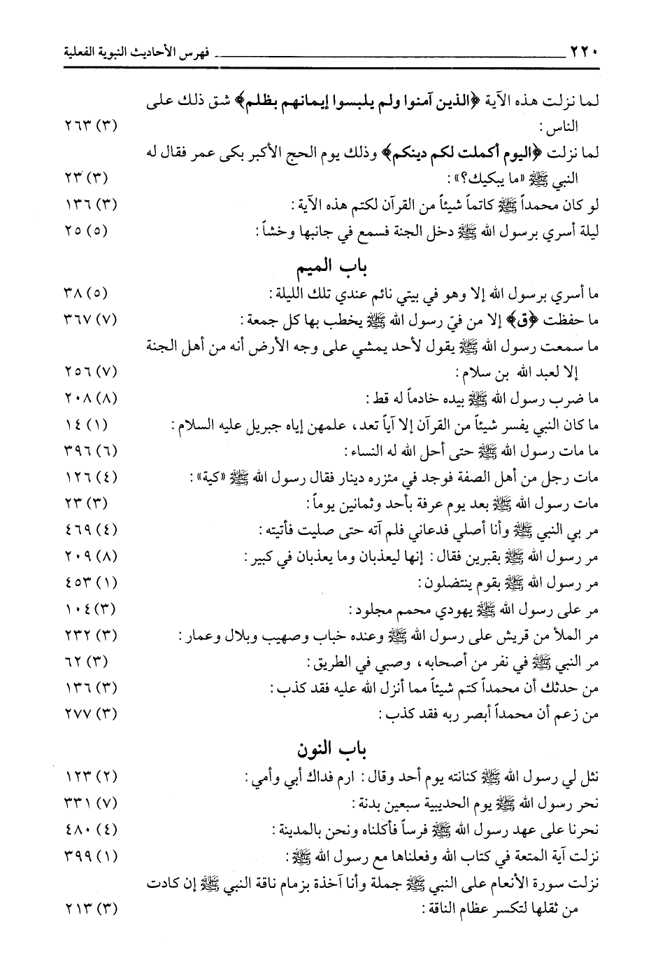 ما أسري برسول الله إِلَّا وَهُوَ فِي بَيْتِي نَائِمٌ عِنْدِي تِلْكَ الليلة: (5) 38 مَا حَفِظْتُ ق إِلَّا مِنْ فِي رَسُولِ اللَّهِ صَلَّى اللَّهُ عَلَيْهِ وَسَلَّمَ يَخْطُبُ بِهَا كل جمعة: (7) 367 مَا سَمِعْتَ رَسُولَ اللَّهِ صَلَّى اللَّهُ عَلَيْهِ وَسَلَّمَ يَقُولُ لِأَحَدٍ يَمْشِي عَلَى وَجْهِ الْأَرْضِ إِنَّهُ مِنْ أَهْلِ الْجَنَّةِ إِلَّا لِعَبْدِ اللَّهِ بن سلام: (7) 256 مَا ضَرَبَ رَسُولَ اللَّهِ صَلَّى اللَّهُ عَلَيْهِ وَسَلَّمَ بِيَدِهِ خادما له قط: (8) 208 ما كان النبي يُفَسِّرُ شَيْئًا مِنَ الْقُرْآنِ إِلَّا آيًا تُعَدُّ، علمهن إياه جبريل عليه السلام: (1) 14 مَا مَاتَ رَسُولُ اللَّهِ صَلَّى اللَّهُ عَلَيْهِ وَسَلَّمَ حتى أحل الله له النساء: (6) 396 مَاتَ رَجُلٌ مِنْ أَهْلِ الصُّفَّةِ فَوُجِدَ فِي مِئْزَرِهِ دِينَارٌ فَقَالَ رَسُولُ اللَّهِ صَلَّى اللَّهُ عَلَيْهِ وَسَلَّمَ «كية» : (4) 126 مَاتَ رَسُولُ اللَّهِ صَلَّى اللَّهُ عَلَيْهِ وَسَلَّمَ بَعْدَ يوم عرفة بأحد وثمانين يوما: (3) 23 مَرَّ بِي النَّبِيُّ صَلَّى اللَّهُ عَلَيْهِ وَسَلَّمَ وَأَنَا أُصَلِّي فَدَعَانِي فَلَمْ آتِهِ حَتَّى صَلَّيْتُ فأتيته: (4) 469 مَرَّ رَسُولُ اللَّهِ صَلَّى اللَّهُ عَلَيْهِ وَسَلَّمَ بقبرين فقال: إنها ليعذبان وما يعذبان في كبير: (8) 209 مَرَّ رَسُولُ اللَّهِ صَلَّى اللَّهُ عَلَيْهِ وَسَلَّمَ بقوم ينتضلون: (1) 453 مَرَّ عَلَى رَسُولِ اللَّهِ صَلَّى اللَّهُ عَلَيْهِ وسلم يهودي محمم مجلود: (3) 104 مَرَّ الْمَلَأُ مِنْ قُرَيْشٍ عَلَى رَسُولِ اللَّهِ صَلَّى اللَّهُ عَلَيْهِ وَسَلَّمَ وَعِنْدَهُ خَبَّابٌ وصُهَيْبٌ وبلال وعمار: (3) 232 مَرَّ النَّبِيُّ صَلَّى اللَّهُ عَلَيْهِ وَسَلَّمَ فِي نَفَرٍ مِنْ أصحابه، وصبي في الطريق: (3) 62 من حدثك أن محمدا كتم شيئا مما أنزل الله عليه فقد كذب: (3) 136 مَنْ زَعَمَ أَنَّ مُحَمَّدًا أَبْصَرَ رَبَّهُ فَقَدْ كذب: (3) 277