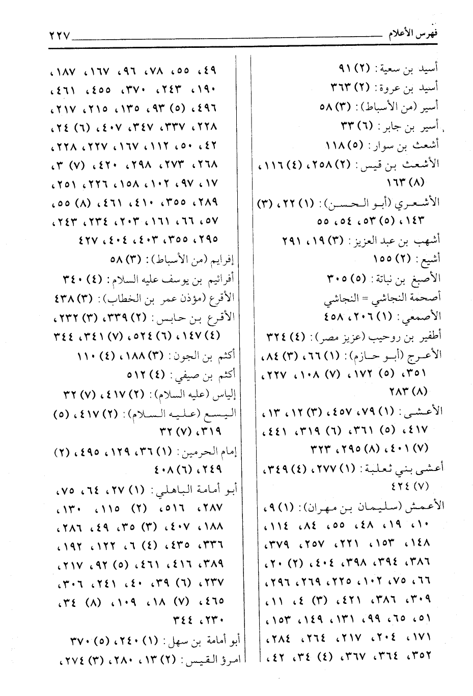 أسيد بن سعية: (2) 91 أسيد بن عروة: (2) 363 أسير (من الأسباط) : (3) 58 أسير بن جابر: (6) 33 أشعث بن سوار: (5) 118 الأشعث بن قيس: (2) 258، (4) 116، (8) 163 الأشعري (أبو الحسن) : (1) 22، (3) 143، (5) 53، 54، 55 أشهب بن عبد العزيز: (3) 19، 291 أشيع: (2) 155 الأصبغ بن نباتة: (5) 305 أصحمة النجاشي النجاشي الأصمعي: (1) 206، 458 أطفير بن روحيب (عزيز مصر) : (4) 324 الأعرج (أبو حازم) : (1) 66، (3) 84، 351، (5) 172، (7) 108، 227، (8) 283 الأعشى: (1) 79، 457، (3) 12، 13، 417، (5) 361، (6) 319، 441، (7) 401، (8) 295، 323 أعشى بني ثعلبة: (1) 277، (4) 349، (7) 424 الأعمش (سليمان بن مهران) : (1) 9، 10، 19، 48، 55، 84، 114، 148، 153، 221، 257، 379، 386، 394، 398، 404، (2) 20، 66، 75، 102، 225، 269، 296، 309، 386، 421، (3) 4، 11، 51، 65، 99، 131، 149، 153، 171، 204، 217، 264، 284، 352، 364، 367، (4) 34، 42، 49، 55، 78، 96، 167، 187، 190، 243، 370، 455، 461، 496، (5) 93، 135، 215، 217، 228، 337، 347، 407، (6) 24، 42، 50، 112، 167، 227، 228، 268، 273، 298، 420، (7) 3، 17، 97، 102، 158، 226، 251، 289، 355، 410، 461، (8) 55، 57، 66، 161، 203، 234، 243، 295، 355، 403، 404، 427 إفرايم (من الأسباط) : (3) 58 أفرائيم بن يوسف عليه السلام: (4) 340 الأقرع (مؤذن عمر بن الخطاب) : (3) 438 الأقرع بن حابس: (2) 339، (3) 232، (4) 147، (6) 524، (7) 341، 344 أكثم بن الجون: (3) 188، (4) 110 أكثم بن صيفي: (4) 512 إلياس (عليه السلام) : (2) 417، (7) 32 اليسع (عليه السلام) : (2) 417، (5) 319، (7) 32 إمام الحرمين: (1) 36، 129، 495، (2) 249، (6) 408 أبو أمامة الباهلي: (1) 27، 64، 75، 287، 516، (2) 115، 130، 188، 407، (3) 35، 49، 286، 336، 435، (4) 6، 122، 192، 389، 416، 461، (5) 92، 217، 237، (6) 39، 40، 241، 306، 465، (7) 18، 109، (8) 34، 230، 344 أبو أمامة بن سهل: (1) 240، (5) 370 امرؤ القيس: (2) 13، 280، (3) 274،