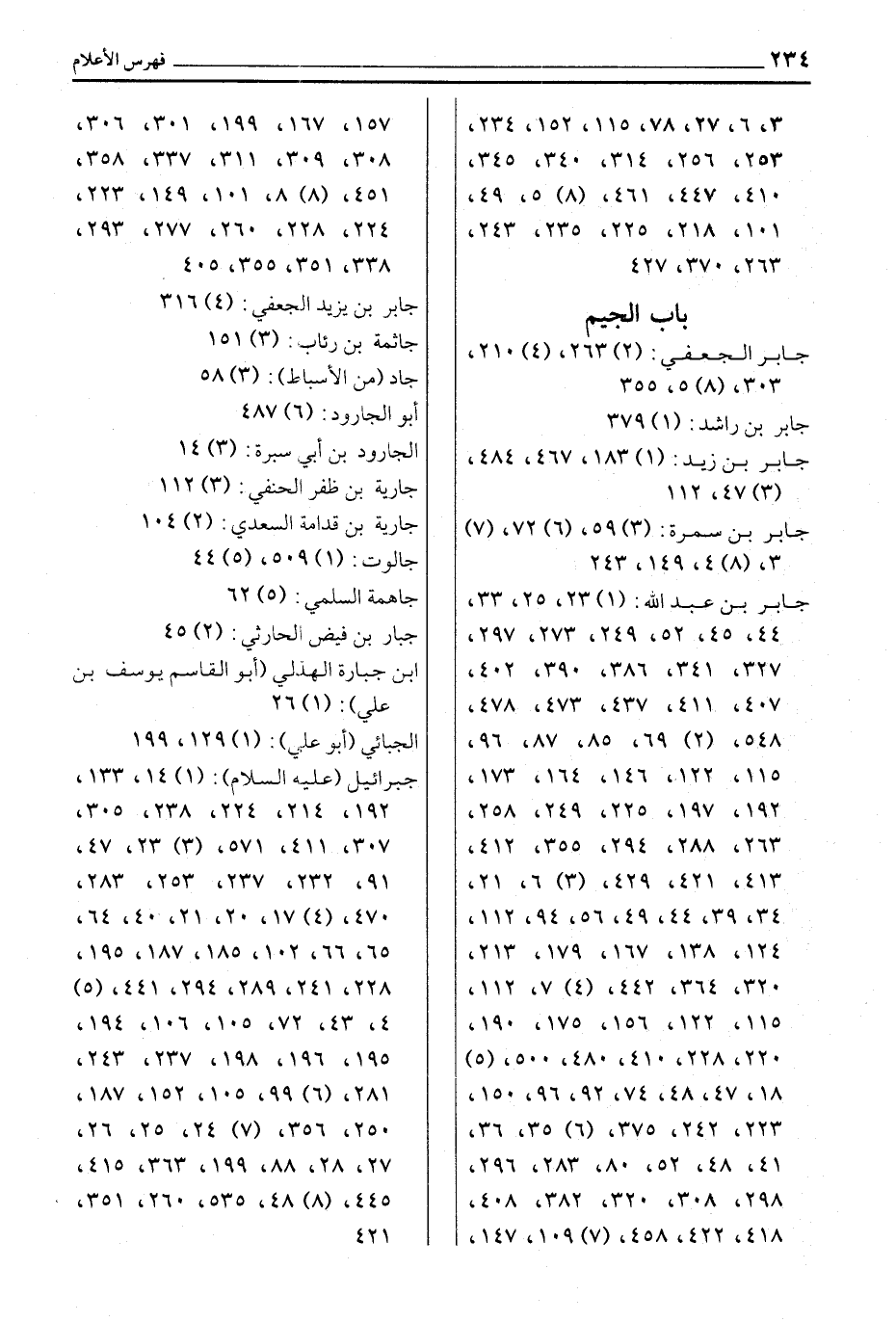 جابر الجعفي: (2) 263، (4) 210، 303، (8) 5، 355 جابر بن راشد: (1) 379 جابر بن زيد: (1) 183، 467، 484، (3) 47، 112 جابر بن سمرة: (3) 59، (6) 72، (7) 3، (8) 4، 149، 243 جابر بن عبد الله: (1) 23، 25، 33، 44، 45، 52، 249، 273، 297، 327، 341، 386، 390، 402، 407، 411، 437، 473، 478، 548، (2) 69، 85، 87، 96، 115، 122، 146، 164، 173، 192، 197، 225، 249، 258، 263، 288، 294، 355، 412، 413، 421، 429، (3) 6، 21، 34، 39، 44، 49، 56، 94، 112، 124، 138، 167، 179، 213، 320، 364، 442، (4) 7، 112، 115، 122، 156، 175، 190، 220، 228، 410، 480، 500، (5) 18، 47، 48، 74، 92، 96، 150، 223، 242، 375، (6) 35، 36، 41، 48، 52، 80، 283، 296، 298، 308، 320، 382، 408، 418، 422، 458، (7) 109، 147، 157، 167، 199، 301، 306، 308، 309، 311، 337، 358، 451، (8) 8، 101، 149، 223، 224، 228، 260، 277، 293، 338، 351، 355، 405 جابر بن يزيد الجعفي: (4) 316 جاثمة بن رئاب: (3) 151 جاد (من الأسباط) : (3) 58 أبو الجارود: (6) 487 الجارود بن أبي سبرة: (3) 14 جارية بن ظفر الحنفي: (3) 112 جارية بن قدامة السعدي: (2) 104 جالوت: (1) 509، (5) 44 جاهمة السلمي: (5) 62 جبار بن فيض الحارثي: (2) 45 ابن جبارة الهذلي (أبو القاسم يوسف بن علي) : (1) 26 الجبائي (أبو علي) : (1) 129، 199 جبرائيل (عليه السلام) : (1) 14، 133، 192، 214، 224، 238، 305، 307، 411، 571، (3) 23، 47، 91، 232، 237، 253، 283، 470، (4) 17، 20، 21، 40، 64، 65، 66، 102، 185، 187، 195، 228، 241، 289، 294، 441، (5) 4، 43، 72، 105، 106، 194، 195، 196، 198، 237، 243، 281، (6) 99، 105، 152، 187، 250، 356، (7) 24، 25، 26، 27، 28، 88، 199، 363، 415، 445، (8) 48، 535، 260، 351، 421