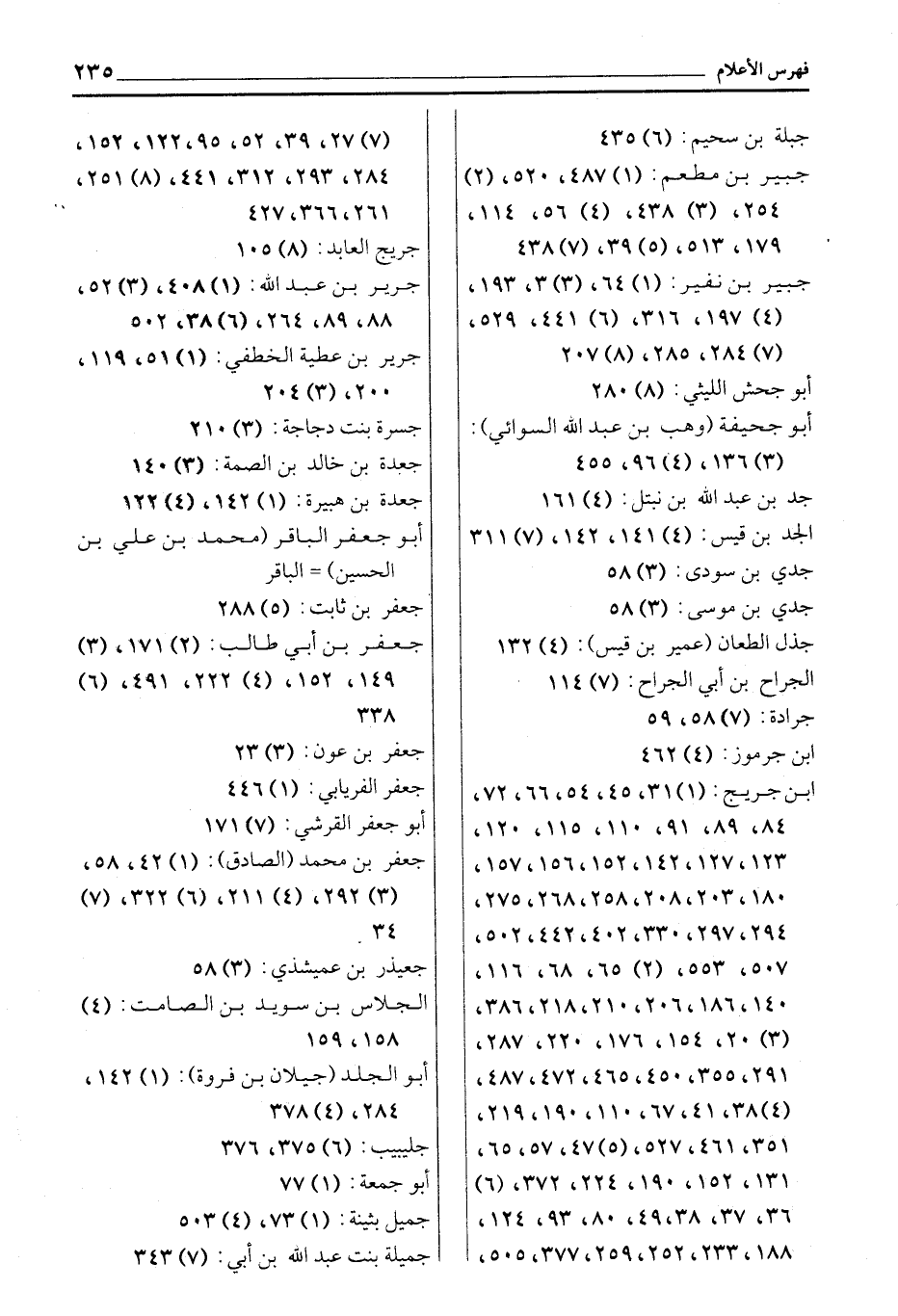 (3) 136، (4) 96، 455 جد بن عبد الله بن نبتل: (4) 161 الجد بن قيس: (4) 141، 142، (7) 311 جدي بن سودى: (3) 58 جدي بن موسى: (3) 58 جذل الطعان (عمير بن قيس) : (4) 132 الجراح بن أبي الجراح: (7) 114 جرادة: (7) 58، 59 ابن جرموز: (4) 462 ابن جريج: (1) 31، 45، 54، 66، 72، 84، 89، 91، 110، 115، 120، 123، 127، 142، 152، 156، 157، 180، 203، 208، 258، 268، 275، 294، 297، 330، 402، 442، 502، 507، 553، (2) 65، 68، 116، 140، 186، 206، 210، 218، 386، (3) 20، 154، 176، 220، 287، 291، 355، 450، 465، 472، 487، (4) 38، 41، 67، 110، 190، 219، 351، 461، 527، (5) 47، 57، 65، 131، 152، 190، 224، 372، (6) 36، 37، 38، 49، 80، 93، 124، 188، 233، 252، 259، 377، 505، (7) 27، 39، 52، 95، 122، 152، 284، 293، 312، 441، (8) 251، 261، 366، 427 جريج العابد: (8) 105 جرير بن عبد الله: (1) 408، (3) 52، 88، 89، 264، (6) 38، 502 جرير بن عطية الخطفي: (1) 51، 119، 200، (3) 204 جسرة بنت دجاجة: (3) 210 جعدة بن خالد بن الصمة: (3) 140 جعدة بن هبيرة: (1) 142، (4) 122 أبو جَعْفَرٍ الْبَاقِرِ (مُحَمَّدِ بْنِ عَلِيِّ بْنِ الْحُسَيْنِ) الباقر جعفر بن ثابت: (5) 288 جعفر بن أبي طالب: (2) 171، (3) 149، 152، (4) 222، 491، (6) 338 جعفر بن عون: (3) 23 جعفر الفريابي: (1) 446 أبو جعفر القرشي: (7) 171 جعفر بن محمد (الصادق) : (1) 42، 58، (3) 292، (4) 211، (6) 322، (7) 34 جعيذر بن عميشذي: (3) 58 الجلاس بن سويد بن الصامت: (4) 158، 159 أبو الجلد (جيلان بن فروة) : (1) 142، 284، (4) 378 جليبيب: (6) 375، 376 أبو جمعة: (1) 77 جميل بثينة: (1) 73، (4) 503 جميلة بنت عبد الله بن أبي: (7) 343