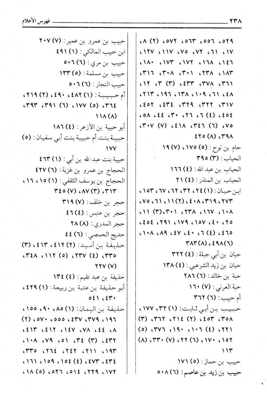 529، 556، 563، 572، (2) 8، 17، 61، 72، 75، 117، 127، 146، 168، 172، 173، 180، 183، 238، 301، 308، 316، 361، 378، 433، (3) 3، 12، 48، 61، 109، 138، 196، 213، 317، 322، 329، 434، 452، 454، (4) 6، 26، 30، 44، 58، 75، (6) 346، 418، (7) 307، 398، (8) 425 حام بن نوح: (5) 175، (7) 19 الحباب: (3) 395 الحباب بن عبد الله: (4) 166 الحباب بن المنذر: (4) 21 ابن حبان: (1) 24، 32، 62، 67، 153، 273، 319، 408، (2) 11، 61، 75، 108، 167، 238، 301، (3) 11، 25، 40، 157، 179، 291، 454، 465، (4) 6، 40، 47، 89، 108، (6) 498، (8) 383 حبان بن أبي جبلة: (4) 322 حبان بن زيد الشرعبي: (4) 138 حبة بن خالد: (6) 286 حبة العرني: (7) 160 أم حبيب: (6) 362 حبيب بن أبي ثابت: (1) 32، 177، 358، 453، (2) 214، 362، (3) 221، (4) 106، 190، 376، (5) 152، 170، (6) 22، (7) 330، (8) 113 حبيب بن حماز: (5) 171 حبيب بن زيد بن عاصم: (6) 508 حبيب بن عمرو بن عمير: (7) 207 ابن حبيب المالكي: (1) 491 حبيب بن مري: (6) 506 حبيب بن مسلمة: (5) 133 حبيب النجار: (6) 506 أم حبيبة: (1) 482، 490، (2) 219، 364، (5) 177، (6) 391، 393، (8) 118 أبو حبيبة بن الأزعر: (4) 186 حَبِيبَةَ بِنْتِ أُمِّ حَبِيبَةَ بِنْتِ أَبِي سُفْيَانَ: (5) 177 حبيبة بنت عبد الله بن أبي: (1) 463 الحجاج بن عمرو بن غزية: (6) 427 الحجاج بن يوسف الثقفي: (1) 15، 16، 313، (3) 87، (7) 345 حجر بن خلف: (7) 319 حجر بن عنبس: (4) 46 حجر المدري: (8) 28 حديج الحمصي: (6) 44 حذيفة بن أسيد: (2) 412، 413، (3) 335، (4) 237، (5) 112، 348، (7) 227 حذيفة بن عبد فقيم: (4) 134 أبو حذيفة بن عتبة بن ربيعة: (1) 429، 430، 541 حذيفة بن اليمان: (1) 85، 90، 155، 196، 379، 437، 555، 570، (2) 8، 44، 78، 147، 412، 413، 432، (3) 34، 51، 79، 108، 193، 211، 242، 264، 335، 434، 473، (4) 154، 159، 161، 172، 229، 514، 526، (5) 18،