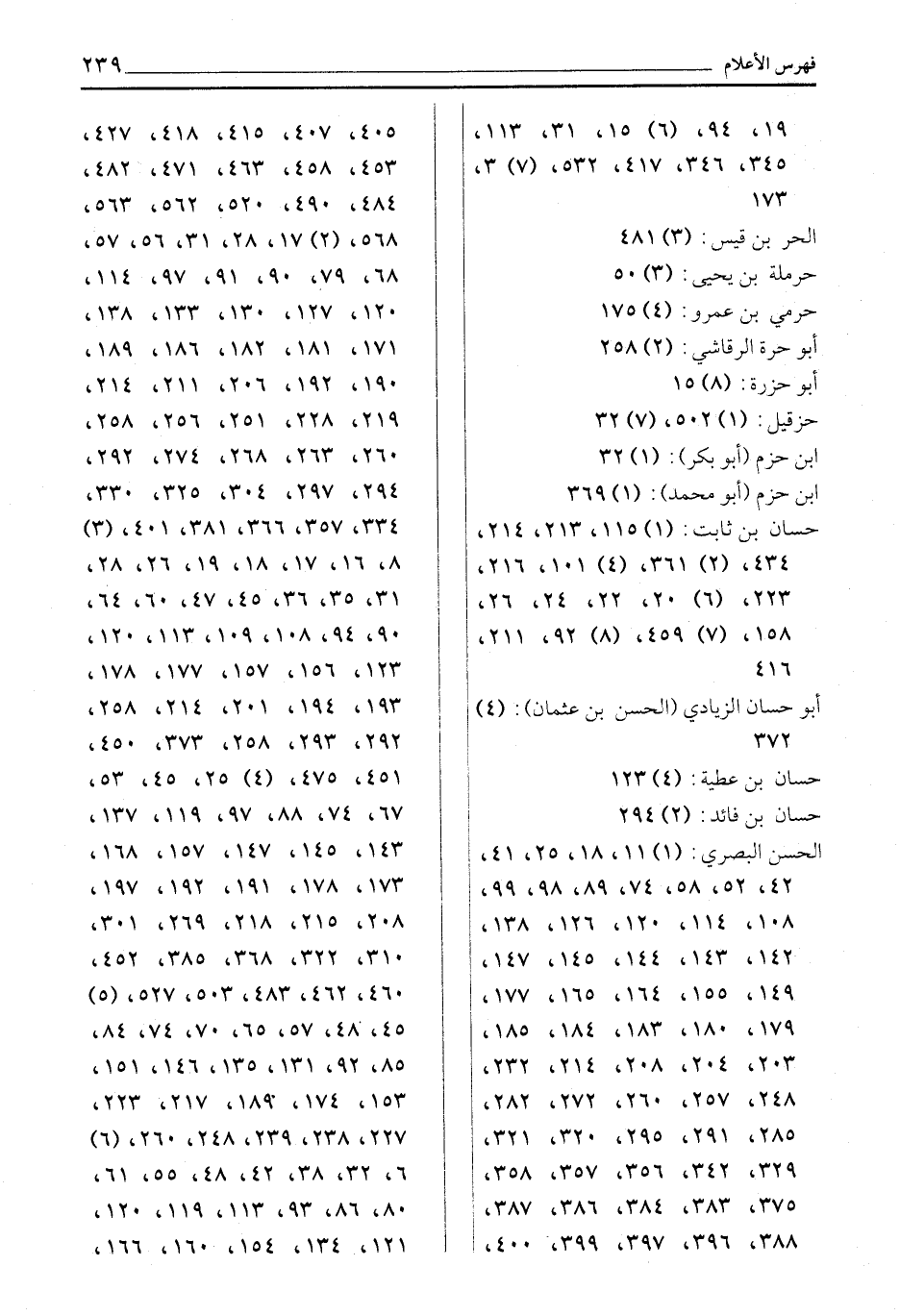 19، 94، (6) 15، 31، 113، 345، 346، 417، 532، (7) 3، 173 الحر بن قيس: (3) 481 حرملة بن يحيى: (3) 50 حرمي بن عمرو: (4) 175 أبو حرة الرقاشي: (2) 258 أبو حزرة: (8) 15 حزقيل: (1) 502، (7) 32 ابن حزم (أبو بكر) : (1) 32 ابن حزم (أبو محمد) : (1) 369 حسان بن ثابت: (1) 115، 213، 214، 434، (2) 361، (4) 101، 216، 223، (6) 20، 22، 24، 26، 158، (7) 459، (8) 92، 211، 416 أبو حسان الزيادي (الحسن بن عثمان) : (4) 372 حسان بن عطية: (4) 123 حسان بن فائد: (2) 294 الحسن البصري: (1) 11، 18، 25، 41، 42، 52، 58، 74، 89، 98، 99، 108، 114، 120، 126، 138، 142، 143، 144، 145، 147، 149، 155، 164، 165، 177، 179، 180، 183، 184، 185، 203، 204، 208، 214، 232، 248، 257، 260، 272، 282، 285، 291، 295، 320، 321، 329، 342، 356، 357، 358، 375، 383، 384، 386، 387، 388، 396، 397، 399، 400، 405، 407، 415، 418، 427، 453، 458، 463، 471، 482، 484، 490، 520، 562، 563، 568، (2) 17، 28، 31، 56، 57، 68، 79، 90، 91، 97، 114، 120، 127، 130، 133، 138، 171، 181، 182، 186، 189، 190، 192، 206، 211، 214، 219، 228، 251، 256، 258، 260، 263، 268، 274، 292، 294، 297، 304، 325، 330، 334، 357، 366، 381، 401، (3) 8، 16، 17، 18، 19، 26، 28، 31، 35، 36، 45، 47، 60، 64، 90، 94، 108، 109، 113، 120، 123، 156، 157، 177، 178، 193، 194، 201، 214، 258، 292، 293، 258، 373، 450، 451، 475، (4) 25، 45، 53، 67، 74، 88، 97، 119، 137، 143، 145، 147، 157، 168، 173، 178، 191، 192، 197، 208، 215، 218، 269، 301، 310، 322، 368، 385، 452، 460، 462، 483، 503، 527، (5) 45، 48، 57، 65، 70، 74، 84، 85، 92، 131، 135، 146، 151، 153، 174، 189، 217، 223، 227، 238، 239، 248، 260، (6) 6، 32، 38، 42، 48، 55، 61، 80، 86، 93، 113، 119، 120، 121، 134، 154، 160، 166،