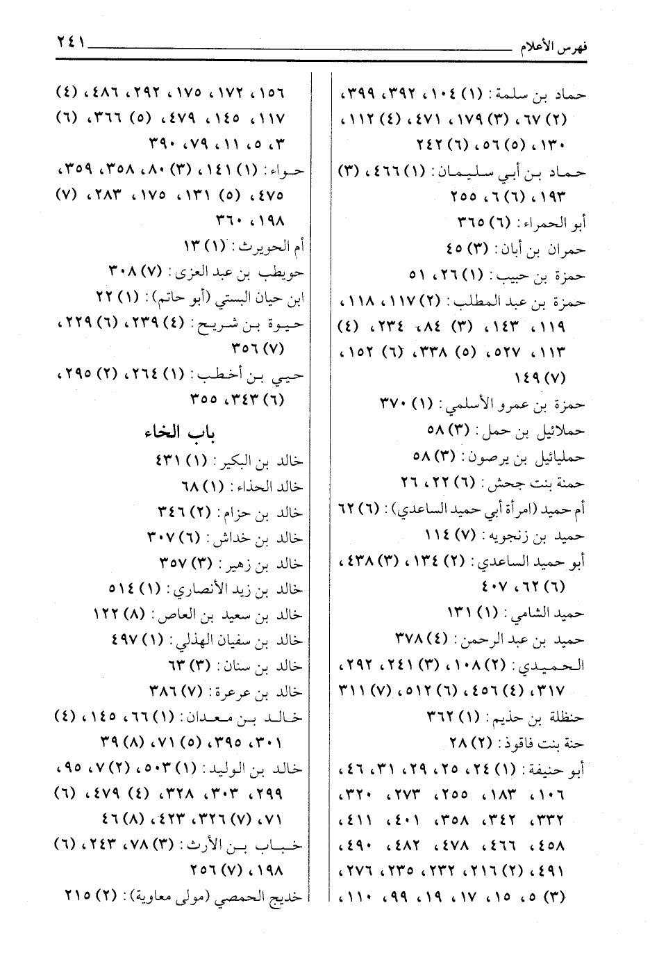 حماد بن سلمة: (1) 104، 392، 399، (2) 67، (3) 179، 471، (4) 112، 130، (5) 56، (6) 242 حماد بن أبي سليمان: (1) 466، (3) 193، (6) 6، 255 أبو الحمراء: (6) 365 حمران بن أبان: (3) 45 حمزة بن حبيب: (1) 26، 51 حمزة بن عبد المطلب: (2) 117، 118، 119، 143، (3) 84، 234، (4) 113، 527، (5) 338، (6) 152، (7) 149 حمزة بن عمرو الأسلمي: (1) 370 حملائيل بن حمل: (3) 58 حمليائيل بن يرصون: (3) 58 حمنة بنت جحش: (6) 22، 26 أم حميد (امرأة أبي حميد الساعدي) : (6) 62 حميد بن زنجويه: (7) 114 أبو حميد الساعدي: (2) 134، (3) 438، (6) 62، 407 حميد الشامي: (1) 131 حميد بن عبد الرحمن: (4) 378 الحميدي: (2) 108، (3) 241، 292، 317، (4) 456، (6) 512، (7) 311 حنظلة بن حذيم: (1) 362 حنة بنت فاقوذ: (2) 28 أبو حنيفة: (1) 24، 25، 29، 31، 46، 106، 183، 255، 273، 320، 332، 342، 358، 401، 411، 458، 466، 478، 482، 490، 491، (2) 216، 232، 235، 276، (3) 5، 15، 17، 19، 99، 110، 156، 172، 175، 292، 486، (4) 117، 145، 479، (5) 366، (6) 3، 5، 11، 79، 390 حواء: (1) 141، (3) 80، 358، 359، 475، (5) 131، 175، 283، (7) 198، 360 أم الحويرث: (1) 13 حويطب بن عبد العزى: (7) 308 ابن حيان البستي (أبو حاتم) : (1) 22 حيوة بن شريح: (4) 239، (6) 229، (7) 356 حيي بن أخطب: (1) 264، (2) 295، (6) 343، 355