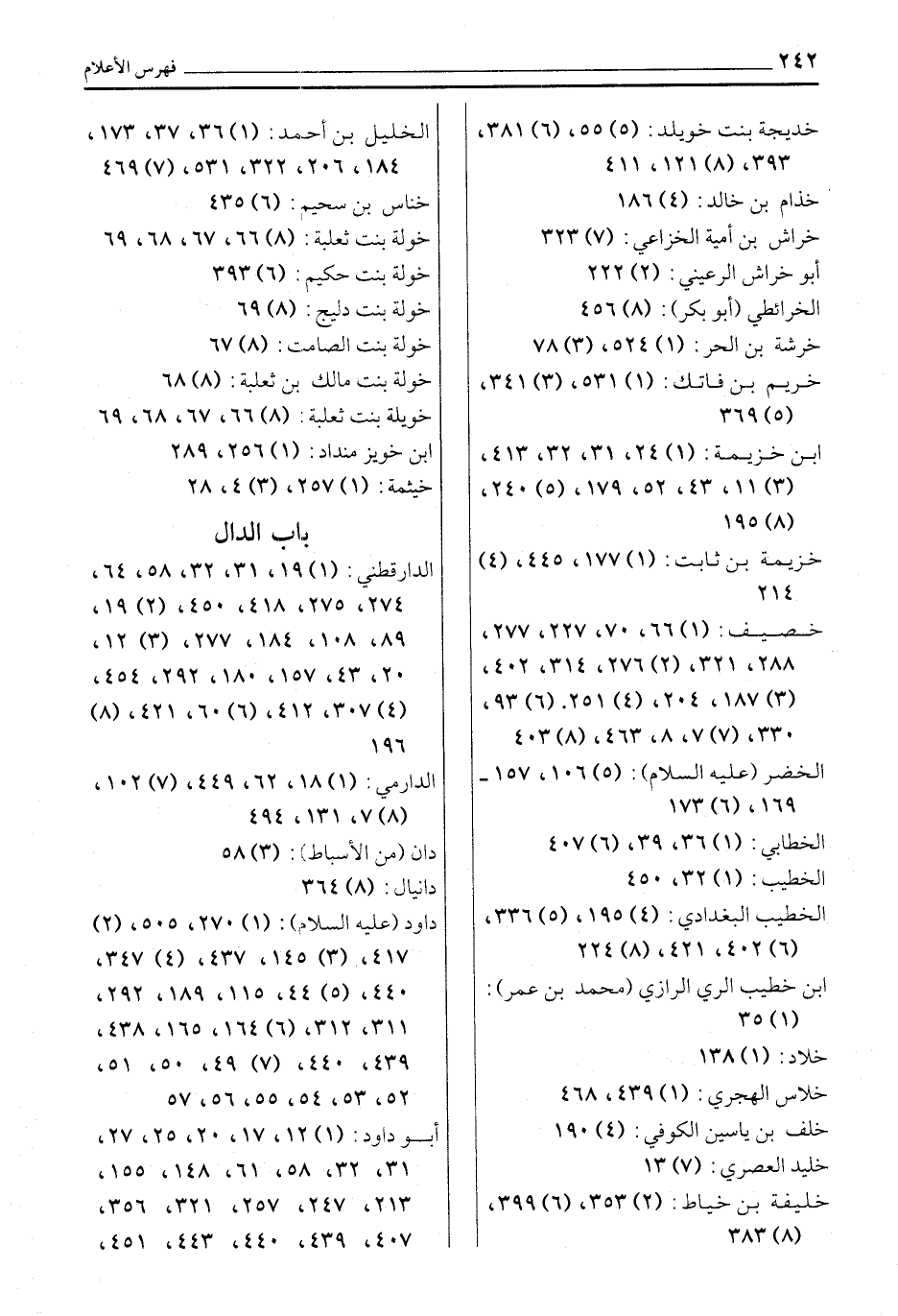 الدارقطني: (1) 19، 31، 32، 58، 64، 274، 275، 418، 450، (2) 19، 89، 108، 184، 277، (3) 12، 20، 43، 157، 180، 292، 454، (4) 307، 412، (6) 60، 421، (8) 196 الدارمي: (1) 18، 62، 449، (7) 102، (8) 7، 131، 494 دان (من الأسباط) : (3) 58 دانيال: (8) 364 داود (عليه السلام) : (1) 270، 505، (2) 417، (3) 145، 437، (4) 347، 440، (5) 44، 115، 189، 292، 311، 312، (6) 164، 165، 438، 439، 440، (7) 49، 50، 51، 52، 53، 54، 55، 56، 57 أبو داود: (1) 12، 17، 20، 25، 27، 31، 32، 58، 61، 148، 155، 213، 247، 257، 321، 356، 407، 439، 440، 443، 451،