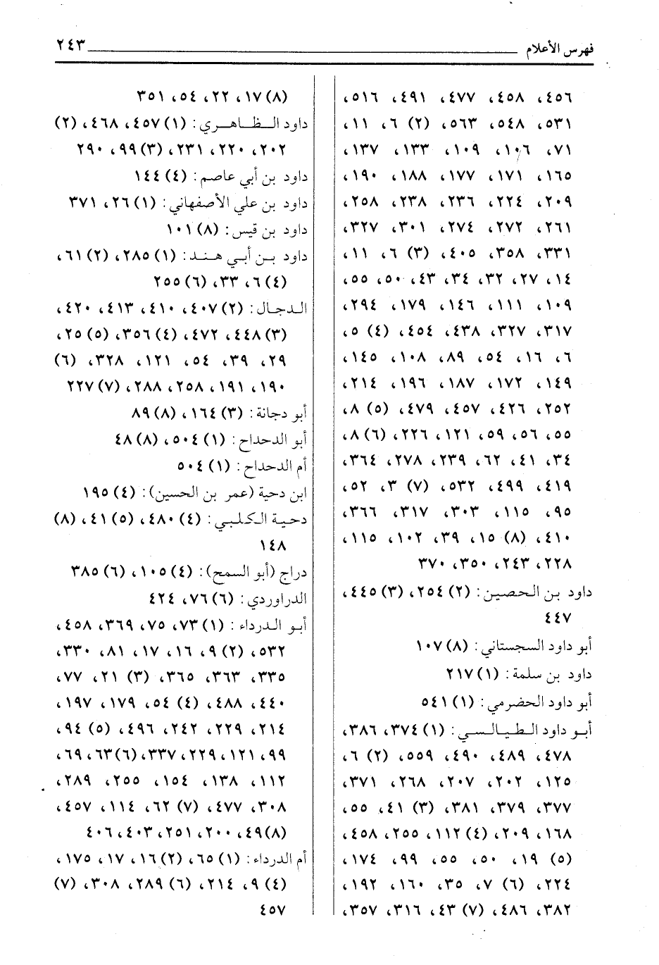 456، 458، 477، 491، 516، 531، 548، 563، (2) 6، 11، 71، 106، 109، 133، 137، 165، 171، 177، 188، 190، 209، 224، 236، 238، 258، 261، 272، 274، 301، 327، 331، 358، 405، (3) 6، 11، 14، 27، 32، 34، 43، 50، 55، 109، 111، 146، 179، 294، 317، 327، 438، 454، (4) 5، 6، 16، 54، 89، 108، 145، 149، 172، 187، 196، 214، 252، 426، 457، 479، (5) 8، 55، 56، 59، 121، 226، (6) 8، 34، 41، 62، 239، 278، 364، 419، 499، 532، (7) 3، 52، 95، 115، 303، 317، 366، 410، (8) 15، 39، 102، 115، 228، 243، 350، 370 داود بن الحصين: (2) 254، (3) 445، 447 أبو داود السجستاني: (8) 107 داود بن سلمة: (1) 217 أبو داود الحضرمي: (1) 541 أبو داود الطيالسي: (1) 374، 386، 478، 489، 490، 559، (2) 6، 125، 202، 207، 268، 371، 377، 379، 381، (3) 41، 55، 168، 209، (4) 112، 255، 458، (5) 19، 50، 55، 99، 174، 224، (6) 7، 35، 160، 192، 382، 486، (7) 43، 316، 357، (8) 17، 22، 54، 351 داود الظاهري: (1) 457، 468، (2) 202، 220، 231، (3) 99، 290 داود بن أبي عاصم: (4) 144 داود بن علي الأصفهاني: (1) 26، 371 داود بن قيس: (8) 101 داود بن أبي هند: (1) 285، (2) 61، (4) 6، 33، (6) 255 الدجال: (2) 407، 410، 413، 420، (3) 448، 472، (4) 356، (5) 25، 29، 39، 54، 121، 328، (6) 190، 191، 258، 288، (7) 227 أبو دجانة: (3) 164، (8) 89 أبو الدحداح: (1) 504، (8) 48 أم الدحداح: (1) 504، (8) 48 أم الدحداح: (1) 504 ابن دحية (عمر بن الحسين) : (4) 195 دحية الكلبي: (4) 480، (5) 41، (8) 148 دراج (أبو السمح) : (4) 105، (6) 385 الدراوردي: (6) 76، 424 أبو الدرداء: (1) 73، 75، 369، 458، 532، (2) 9، 16، 17، 81، 330، 335، 363، 365، (3) 21، 77، 440، 488، (4) 54، 179، 197، 214، 229، 242، 496، (5) 94، 99، 121، 229، 337، (6) 63، 69، 112، 138، 154، 255، 289، 308، 477، (7) 62، 114، 457، (8) 49، 200، 251، 403، 406 أم الدرداء: (1) 65، (2) 16، 17، 175، (4) 9، 214، (6) 289، 308، (7) 457