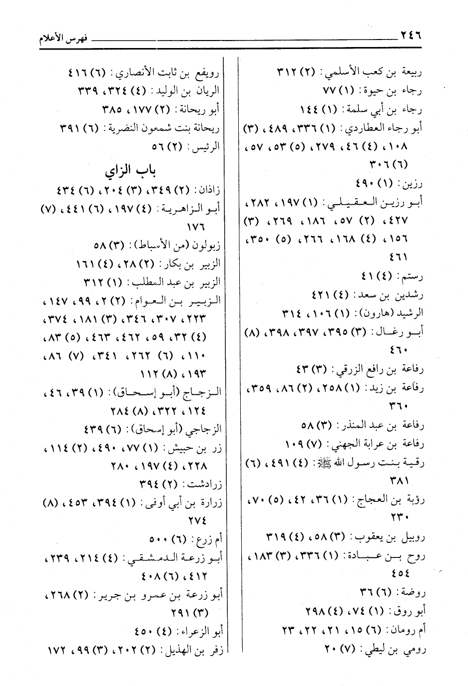 زاذان: (2) 349، (3) 204، (6) 434 أبو الزاهرية: (4) 197، (6) 441، (7) 176 زبولون (من الأسباط) : (3) 58 الزبير بن بكار: (2) 28، (4) 161 الزبير بن عبد المطلب: (1) 312 الزبير بن العوام: (2) 2، 99، 147، 223، 307، 346، (3) 181، 374، (4) 32، 59، 462، 463، (5) 83، 110، (6) 262، 341، (7) 86، 193، (8) 112 الزجاج (أبو إسحاق) : (1) 39، 46، 124، 322، (8) 284 الزجاجي (أبو إسحاق) : (6) 439 زر بن حبيش: (1) 77، 490، (2) 114، 228، (4) 197، 280 زرادشت: (2) 394 زرارة بن أبي أوفى: (1) 394، 453، (8) 274 أم زرع: (6) 500 أبو زرعة الدمشقي: (4) 214، 239، 412، (6) 408 أبو زرعة بن عمرو بن جرير: (2) 268، (3) 291 أبو الزعراء: (4) 450 زفر بن الهذيل: (2) 202، (3) 99، 172
