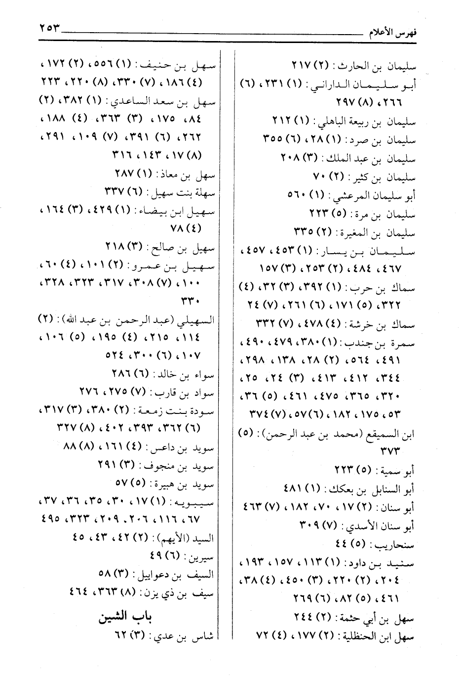 سليمان بن الحارث: (2) 217 أبو سليمان الداراني: (1) 231، (6) 266، (8) 297 سليمان بن ربيعة الباهلي: (1) 212 سليمان بن صرد: (1) 28، (6) 355 سليمان بن عبد الملك: (3) 208 سليمان بن كثير: (2) 70 أبو سليمان المرعشي: (1) 560 سليمان بن مرة: (5) 223 سليمان بن المغيرة: (2) 335 سليمان بن يسار: (1) 453، 457، 467، 484، (2) 253، (3) 157 سماك بن حرب: (1) 392، (3) 32، (4) 322، (5) 171، (6) 261، (7) 24 سماك بن خرشة: (4) 478، (7) 332 سمرة بن جندب: (1) 380، 479، 490، 491، 564، (2) 28، 138، 298، 344، 412، 413، (3) 24، 25، 320، 365، 475، 461، (5) 36، 53، 175، 182، (6) 57، (7) 374 ابن السميقع (محمد بن عبد الرحمن) : (5) 373 أبو سمية: (5) 223 أبو السنابل بن بعكك: (1) 481 أبو سنان: (2) 17، 70، 182، (7) 463 أبو سنان الأسدي: (7) 309 سنحاريب: (5) 44 سنيد بن داود: (1) 113، 157، 193، 204، (2) 220، (3) 450، (4) 38، 461، (5) 82، (6) 269 سهل بن أبي حثمة: (2) 244 سهل ابن الحنظلية: (2) 177، (4) 72 سهل بن حنيف: (1) 556، (2) 172، (4) 186، (7) 330، (8) 220، 223 سهل بن سعد الساعدي: (1) 382، (2) 84، 175، (3) 363، (4) 188، 262، (6) 391، (7) 109، 291، (8) 17، 143، 316 سهل بن معاذ: (1) 287 سهلة بنت سهيل: (6) 337 سهيل ابن بيضاء: (1) 429، (3) 164، (4) 78 سهيل بن صالح: (3) 218 سهيل بن عمرو: (2) 101، (4) 60، 100، (7) 308، 317، 323، 328، 330 السهيلي (عبد الرحمن بن عبد الله) : (2) 114، 215، (4) 195، (5) 106، 107، (6) 300، 524 سواء بن خالد: (6) 286 سواد بن قارب: (7) 275، 276 سودة بنت زمعة: (2) 380، (3) 317، (6) 362، 393، 402، (8) 327 سويد بن داعس: (4) 161، (8) 88 سويد بن منجوف: (3) 291 سويد بن هبيرة: (5) 57 سيبويه: (1) 17، 30، 35، 36، 37، 67، 116، 206، 209، 323، 495 السيد (الأيهم) : (2) 42، 43، 45 سيرين: (6) 49 السيف بن دعواييل: (3) 58 سيف بن ذي يزن: (8) 363، 464