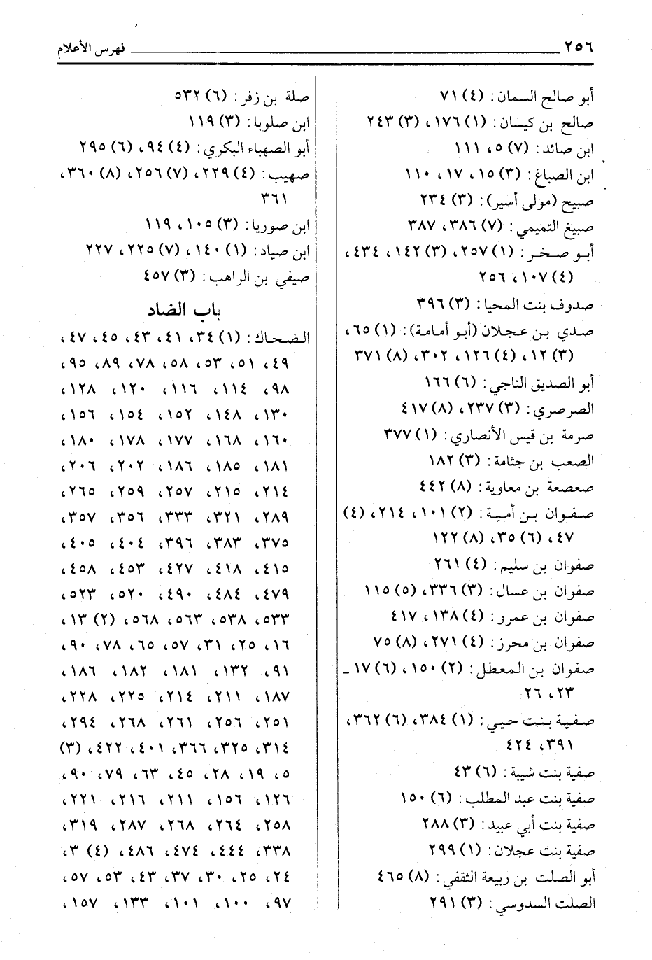 أبو صالح السمان: (4) 71 صالح بن كيسان: (1) 176، (3) 243 ابن صائد: (7) 5، 111 ابن الصباغ: (3) 15، 17، 110 صبيح (مولى أسير) : (3) 234 صبيغ التميمي: (7) 386، 387 أبو صخر: (1) 257، (3) 142، 434، (4) 107، 256 صدوف بنت المحيا: (3) 396 صدي بن عجلان (أبو أمامة) : (1) 65، (3) 12، (4) 126، 302، (8) 371 أبو الصديق الناجي: (6) 166 الصرصري: (3) 237، (8) 417 صرمة بن قيس الأنصاري: (1) 377 الصعب بن جثامة: (3) 182 صعصعة بن معاوية: (8) 442 صفوان بن أمية: (2) 101، 214، (4) 47، (6) 35، (8) 122 صفوان بن سليم: (4) 261 صفوان بن عسال: (3) 336، (5) 115 صفوان بن عمرو: (4) 138، 417 صفوان بن محرز: (4) 271، (8) 75 صفوان بن المعطل: (2) 150، (6) 17- 23، 26 صفية بنت حيي: (1) 384، (6) 362، 391، 424 صفية بنت شيبة: (6) 43 صفية بنت عبد المطلب: (6) 150 صفية بنت أبي عبيد: (3) 288 صفية بنت عجلان: (1) 299 أبو الصلت بن ربيعة الثقفي: (8) 465 الصلت السدوسي: (3) 291 صلة بن زفر: (6) 532 ابن صلوبا: (3) 119 أبو الصهباء البكري: (4) 94، (6) 295 صهيب: (4) 229، (7) 256، (8) 360، 361 ابن صوريا: (3) 105، 119 ابن صياد: (1) 140، (7) 225، 227 صيفي بن الراهب: (3) 457