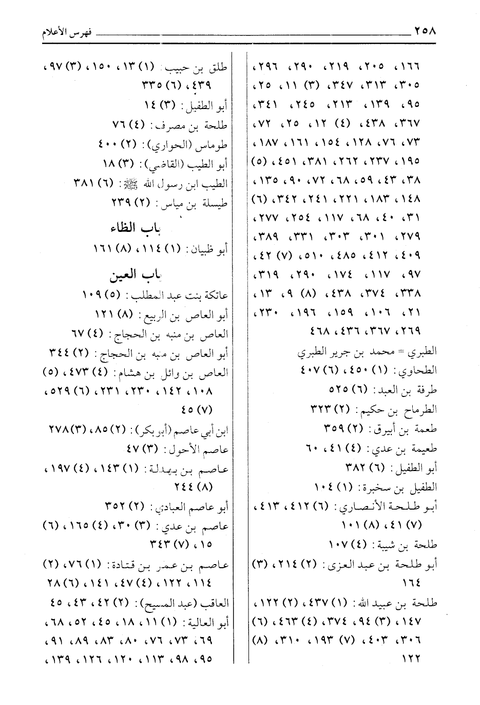166، 205، 219، 290، 296، 305، 313، 347، (3) 11، 25، 95، 139، 213، 245، 341، 367، 438، (4) 12، 25، 72، 73، 76، 128، 154، 161، 187، 195، 237، 262، 381، 451، (5) 38، 43، 59، 68، 72، 90، 135، 148، 183، 221، 241، 342، (6) 31، 40، 68، 117، 254، 277، 279، 301، 303، 331، 389، 409، 412، 485، 510، (7) 42، 97، 117، 174، 290، 319، 338، 374، 438، (8) 9، 13، 21، 106، 159، 196، 230، 269، 367، 436، 468 الطبري محمد بن جرير الطبري الطحاوي: (1) 450، (6) 407 طرفة بن العبد: (6) 525 الطرماح بن حكيم: (2) 323 طعمة بن أبيرق: (2) 359 طعيمة بن عدي: (4) 41، 60 أبو الطفيل: (6) 382 الطفيل بن سخبرة: (1) 104 أبو طلحة الأنصاري: (6) 412، 413، (7) 41، (8) 101 طلحة بن شيبة: (4) 107 أبو طلحة بن عبد العزى: (2) 214، (3) 164 طلحة بن عبيد الله: (1) 437، (2) 122، 147، (3) 94، 374، (4) 463، (6) 306، 403، (7) 193، 310، (8) 122 طلق بن حبيب: (1) 13، 150، (3) 97، 439، (6) 335 أبو الطفيل: (3) 14 طلحة بن مصرف: (4) 76 طوماس (الحواري) : (2) 400 أبو الطيب (القاضي) : (3) 18 الطيب ابْنُ رَسُولِ اللَّهِ صَلَّى اللَّهُ عَلَيْهِ وَسَلَّمَ: (6) 381 طيسلة بن مياس: (2) 239