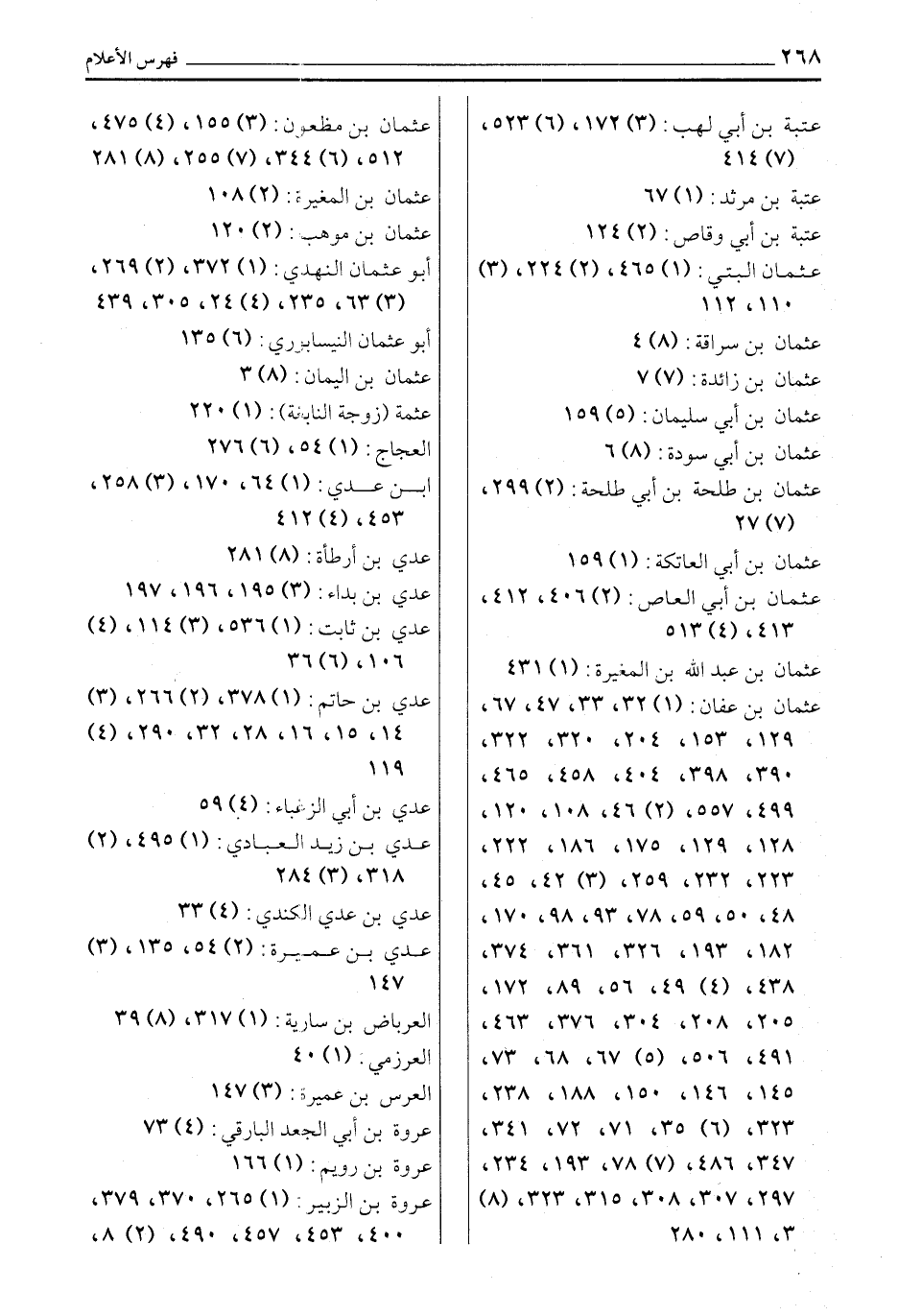 عتبة بن أبي لهب: (3) 172، (6) 523، (7) 414 عتبة بن مرثد: (1) 67 عتبة بن أبي وقاص: (2) 124 عثمان البتي: (1) 465، (2) 224، (3) 110، 112 عثمان بن سراقة: (8) 4 عثمان بن زائدة: (7) 7 عثمان بن أبي سليمان: (5) 159 عثمان بن أبي سودة: (8) 6 عثمان بن طلحة بن أبي طلحة: (2) 299، (7) 27 عثمان بن أبي العاتكة: (1) 159 عثمان بن أبي العاص: (2) 406، 412، 413، (4) 513 عثمان بن عبد الله بن المغيرة: (1) 431 عثمان بن عفان: (1) 32، 33، 47، 67، 129، 153، 204، 320، 322، 390، 398، 404، 458، 465، 499، 557، (2) 46، 108، 120، 128، 129، 175، 186، 222، 223، 232، 259، (3) 42، 45، 48، 50، 59، 78، 93، 98، 170، 182، 193، 326، 361، 374، 438، (4) 49، 56، 89، 172، 205، 208، 304، 376، 463، 491، 506، (5) 67، 68، 73، 145، 146، 150، 188، 238، 323، (6) 35، 71، 72، 341، 347، 486، (7) 78، 193، 234، 297، 307، 308، 315، 323، (8) 3، 111، 280 عثمان بن مظعون: (3) 155، (4) 475، 512، (6) 344، (7) 255، (8) 281 عثمان بن المغيرة: (2) 108 عثمان بن موهب: (2) 120 أبو عثمان النهدي: (1) 372، (2) 269، (3) 63، 235، (4) 24، 305، 439 أبو عثمان النيسابوري: (6) 135 عثمان بن اليمان: (8) 3 عثمة (زوجة النابغة) : (1) 220 العجاج: (1) 54، (6) 276 ابن عدي: (1) 64، 170، (3) 258، 453، (4) 412 عدي بن أرطأة: (8) 281 عدي بن بداء: (3) 195، 196، 197 عدي بن ثابت: (1) 536، (3) 114، (4) 106، (6) 36 عدي بن حاتم: (1) 378، (2) 266، (3) 14، 15، 16، 28، 32، 290، (4) 119 عدي بن أبي الزغباء: (4) 59 عدي بن زيد العبادي: (1) 495، (2) 318، (3) 284 عدي بن عدي الكندي: (4) 33 عدي بن عميرة: (2) 54، 135، (3) 147 العرباض بن سارية: (1) 317، (8) 39 العرزمي: (1) 40 العرس بن عميرة: (3) 147 عروة بن أبي الجعد البارقي: (4) 73 عروة بن رويم: (1) 166 عروة بن الزبير: (1) 265، 370، 379، 400، 453، 457، 490، (2) 8،