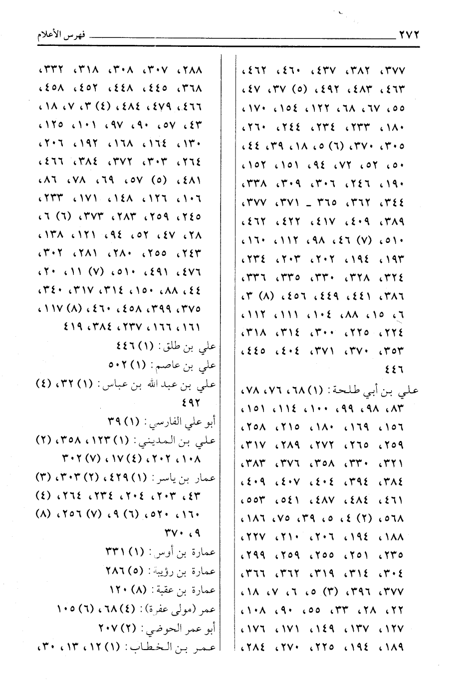 377، 382، 437، 460، 462، 463، 483، 492، (5) 37، 47، 55، 67، 68، 122، 154، 170، 180، 233، 234، 244، 260، 305، 370، (6) 5، 18، 39، 44، 50، 52، 72، 94، 151، 152، 190، 246، 306، 309، 338، 344، 362، 365- 371، 377، 389، 409، 417، 422، 462، 510، (7) 46، 98، 112، 160، 193، 194، 202، 203، 234، 324، 328، 330، 335، 336، 386، 441، 449، 456، (8) 3، 6، 15، 88، 104، 111، 112، 224، 225، 300، 314، 318، 353، 370، 371، 404، 445، 446 علي بن أبي طلحة: (1) 68، 76، 78، 83، 98، 99، 100، 114، 151، 156، 169، 180، 215، 258، 259، 265، 272، 289، 317، 321، 330، 358، 376، 383، 384، 394، 404، 407، 409، 461، 484، 487، 541، 553، 568، (2) 4، 5، 39، 75، 186، 188، 194، 206، 210، 227، 235، 251، 255، 259، 299، 304، 314، 319، 362، 366، 377، 396، (3) 5، 6، 7، 18، 22، 28، 33، 55، 90، 108، 127، 137، 149، 171، 176، 189، 194، 225، 270، 284، 288، 307، 308، 318، 332، 368، 445، 448، 452، 458، 466، 479، 484، (4) 3، 7، 18، 43، 57، 90، 97، 101، 125، 130، 164، 168، 192، 206، 264، 303، 372، 384، 466، 481، (5) 57، 69، 78، 86، 106، 126، 148، 171، 233، 245، 259، 283، 373، (6) 6، 28، 47، 52، 94، 121، 138، 243، 255، 280، 281، 302، 476، 491، 510، (7) 11، 20، 44، 88، 150، 314، 317، 340، 375، 399، 458، 460، (8) 117، 161، 166، 237، 384، 419 علي بن طلق: (1) 446 علي بن عاصم: (1) 502 علي بن عبد الله بن عباس: (1) 32، (4) 492 أبو علي الفارسي: (1) 39 علي بن المديني: (1) 123، 358، (2) 108، 202، (4) 17، (7) 302 عمار بن ياسر: (1) 429، (2) 303، (3) 43، 203، 204، 234، 264، (4) 160، 520، (6) 9، (7) 256، (8) 9، 370 عمارة بن أوس: (1) 331 عمارة بن رؤيبة: (5) 286 عمارة بن عقبة: (8) 120 عمر (مولى عفرة) : (4) 68، (6) 105 أبو عمر الحوضي: (2) 207 عمر بن الخطاب: (1) 12، 13، 30،