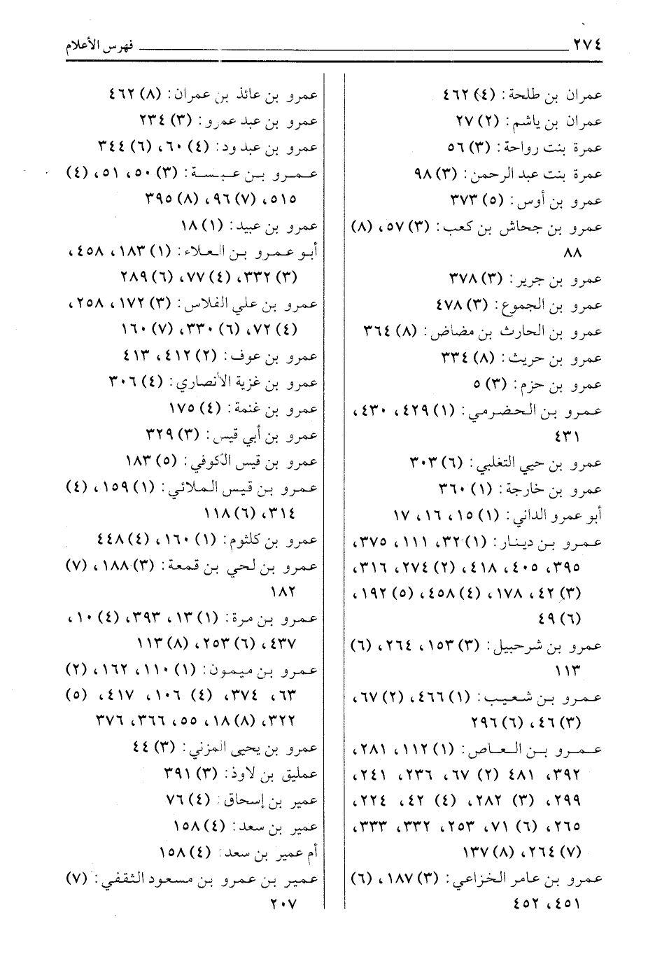 عمران بن طلحة: (4) 462 عمران بن ياشم: (2) 27 عمرة بنت رواحة: (3) 56 عمرة بنت عبد الرحمن: (3) 98 عمرو بن أوس: (5) 373 عمرو بن جحاش بن كعب: (3) 57، (8) 88 عمرو بن جرير: (3) 378 عمرو بن الجموع: (3) 478 عمرو بن الحارث بن مضاض: (8) 364 عمرو بن حريث: (8) 334 عمرو بن حزم: (3) 5 عمرو بن الحضرمي: (1) 429، 430، 431 عمرو بن حيي التغلبي: (6) 303 عمرو بن خارجة: (1) 360 أبو عمرو الداني: (1) 15، 16، 17 عمرو بن دينار: (1) 32، 111، 375، 395، 405، 418، (2) 274، 316، (3) 42، 178، (4) 458، (5) 192، (6) 49 عمرو بن شرحبيل: (3) 153، 264، (6) 113 عمرو بن شعيب: (1) 466، (2) 67، (3) 46، (6) 296 عمرو بن العاص: (1) 112، 281، 392، 481 (2) 67، 236، 241، 299، (3) 282، (4) 42، 224، 265، (6) 71، 253، 332، 333، (7) 264، (8) 137 عمرو بن عامر الخزاعي: (3) 187، (6) 451، 452 عمرو بن عائذ بن عمران: (8) 462 عمرو بن عبد عمرو: (3) 234 عمرو بن عبد ود: (4) 60، (6) 344 عمرو بن عبسة: (3) 50، 51، (4) 515، (7) 96، (8) 395 عمرو بن عبيد: (1) 18 أبو عمرو بن العلاء: (1) 183، 458، (3) 332، (4) 77، (6) 289 عمرو بن علي الفلاس: (3) 172، 258، (4) 72، (6) 330، (7) 160 عمرو بن عوف: (2) 412، 413 عمرو بن غزية الأنصاري: (4) 306 عمرو بن غنمة: (4) 175 عمرو بن أبي قيس: (3) 329 عمرو بن قيس الكوفي: (5) 183 عمرو بن قيس الملائي: (1) 159، (4) 314، (6) 118 عمرو بن كلثوم: (1) 160، (4) 448 عمرو بن لحي بن قمعة: (3) 188، (7) 182 عمرو بن مرة: (1) 13، 393، (4) 10، 437، (6) 253، (8) 113 عمرو بن ميمون: (1) 110، 162، (2) 63، 374، (4) 106، 417، (5) 322، (8) 18، 55، 366، 376 عمرو بن يحيى المزني: (3) 44 عمليق بن لاوذ: (3) 391 عمير بن إسحاق: (4) 76 عمير بن سعد: (4) 158 أم عمير بن سعد: (4) 158 عمير بن عمرو بن مسعود الثقفي: (7) 207