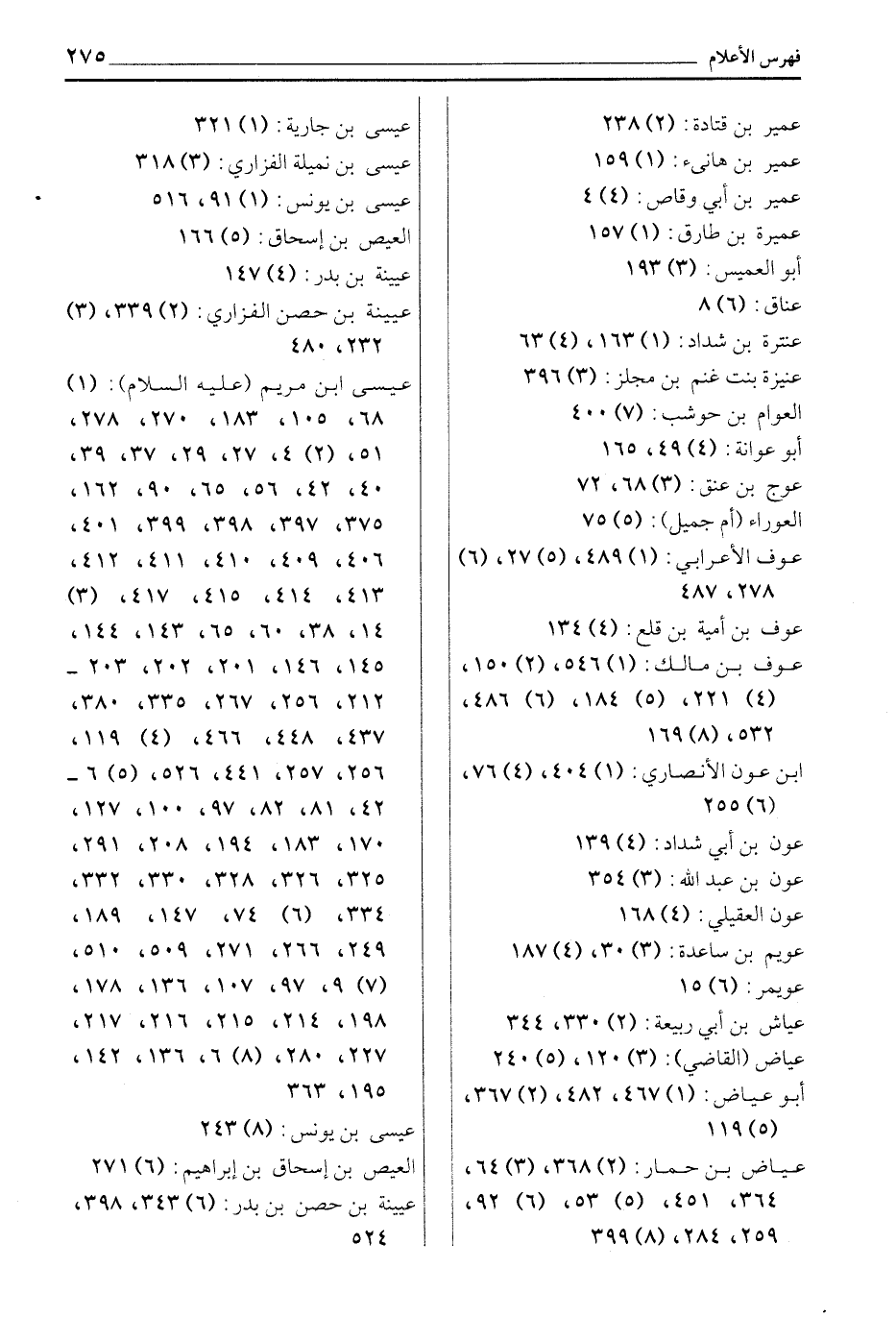 عمير بن قتادة: (2) 238 عمير بن هانئ: (1) 159 عمير بن أبي وقاص: (4) 4 عميرة بن طارق: (1) 157 أبو العميس: (3) 193 عناق: (6) 8 عنترة بن شداد: (1) 163، (4) 63 عنيزة بنت غنم بن مجلز: (3) 396 العوام بن حوشب: (7) 400 أبو عوانة: (4) 49، 165 عوج بن عنق: (3) 68، 72 العوراء (أم جميل) : (5) 75 عوف الأعرابي: (1) 489، (5) 27، (6) 278، 487 عوف بن أمية بن قلع: (4) 134 عوف بن مالك: (1) 546، (2) 150، (4) 221، (5) 184، (6) 486، 532، (8) 169 ابن عون الأنصاري: (1) 404، (4) 76، (6) 255 عون بن أبي شداد: (4) 139 عون بن عبد الله: (3) 354 عون العقيلي: (4) 168 عويم بن ساعدة: (3) 30، (4) 187 عويمر: (6) 15 عياش بن أبي ربيعة: (2) 330، 344 عياض (القاضي) : (3) 120، (5) 240 أبو عياض: (1) 467، 482، (2) 367، (5) 119 عياض بن حمار: (2) 368، (3) 64، 364، 451، (5) 53، (6) 92، 259، 284، (8) 399 عيسى بن جارية: (1) 321 عيسى بن نميلة الفزاري: (3) 318 عيسى بن يونس: (1) 91، 516 العيص بن إسحاق: (5) 166 عيينة بن بدر: (4) 147 عيينة بن حصن الفزاري: (2) 339، (3) 232، 480 عيسى بن مريم (عليه السلام) : (1) 68، 105، 183، 270، 278، 51، (2) 4، 27، 29، 37، 39، 40، 42، 56، 65، 90، 162، 375، 397، 398، 399، 401، 406، 409، 410، 411، 412، 413، 414، 415، 417، (3) 14، 38، 60، 65، 143، 144، 145، 146، 201، 202، 203- 212، 256، 267، 335، 380، 437، 448، 466، (4) 119، 256، 257، 441، 526، (5) 6- 42، 81، 82، 97، 100، 127، 170، 183، 194، 208، 291، 325، 326، 328، 330، 332، 334، (6) 74، 147، 189، 249، 266، 271، 509، 510، (7) 9، 97، 107، 136، 178، 198، 214، 215، 216، 217، 227، 280، (8) 6، 136، 142، 195، 363 عيسى بن يونس: (8) 243 العيص بن إسحاق بن إبراهيم: (6) 271 عيينة بن حصن بن بدر: (6) 343، 398، 524