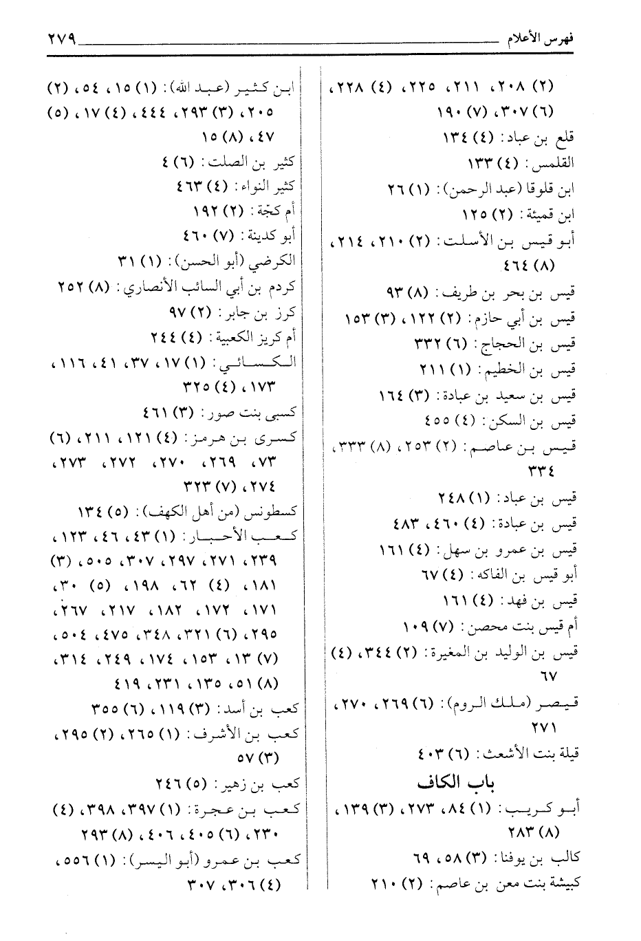 أبو كريب: (1) 84، 273، (3) 139، (8) 283 كالب بن يوفنا: (3) 58، 69 كبيشة بنت معن بن عاصم: (2) 210 ابن كثير (عبد الله) : (1) 15، 54، (2) 205، (3) 293، 444، (4) 17، (5) 47، (8) 15 كثير بن الصلت: (6) 4 كثير النواء: (4) 463 أم كجّة: (2) 192 أبو كدينة: (7) 460 الكرخي (أبو الحسن) : (1) 31 كردم بن أبي السائب الأنصاري: (8) 252 كرز بن جابر: (2) 97 أم كريز الكعبية: (4) 244 الكسائي: (1) 17، 37، 41، 116، 173، (4) 325 كسبي بنت صور: (3) 461 كسرى بن هرمز: (4) 121، 211، (6) 73، 269، 270، 272، 273، 274، (7) 323 كسطونس (من أهل الكهف) : (5) 134 كعب الأحبار: (1) 43، 46، 123، 239، 271، 297، 307، 505، (3) 181، (4) 62، 198، (5) 30، 171، 172، 182، 217، 267، 295، (6) 321، 348، 475، 504، (7) 13، 153، 174، 249، 314، (8) 51، 135، 231، 419 كعب بن أسد: (3) 119، (6) 355 كعب بن الأشرف: (1) 265، (2) 295، (3) 57 كعب بن زهير: (5) 246 كعب بن عجرة: (1) 397، 398، (4) 230، (6) 405، 406، (8) 293 كعب بن عمرو (أبو اليسر) : (1) 556، (4) 306، 307