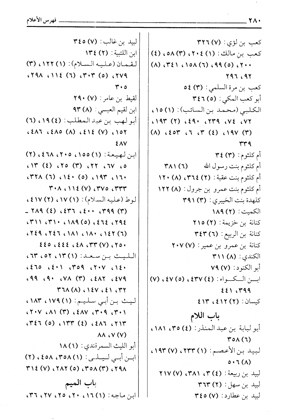 كعب بن لؤي: (7) 326 كعب بن مالك: (1) 204، (3) 58، (4) 200، (5) 99، (6) 158، 341، (8) 92، 296 كعب بن مرة السلمي: (3) 54 أبو كعب المكي: (5) 346 الكلبي (محمد بن السائب) : (1) 15، 72، 74، 239، 490، (2) 193، (3) 197، (4) 3، 6، 453، (8) 339 أم كلثوم: (3) 34 أم كلثوم بنت رسول الله (6) 381 أم كلثوم بنت عقبة: (2) 364، (8) 120 أم كلثوم بنت عمرو بن جرول: (8) 122 كلهدة بنت الخيبري: (3) 391 الكميت: (2) 189 كنانة بن خزيمة: (2) 215 كنانة بن الربيع: (6) 343 كنانة بن عمرو بن عمير: (7) 207 الكندي: (8) 311 أبو الكنود: (7) 79 ابن الكواء: (4) 437، (5) 47، (7) 399، 441 كيسان: (2) 412، 413