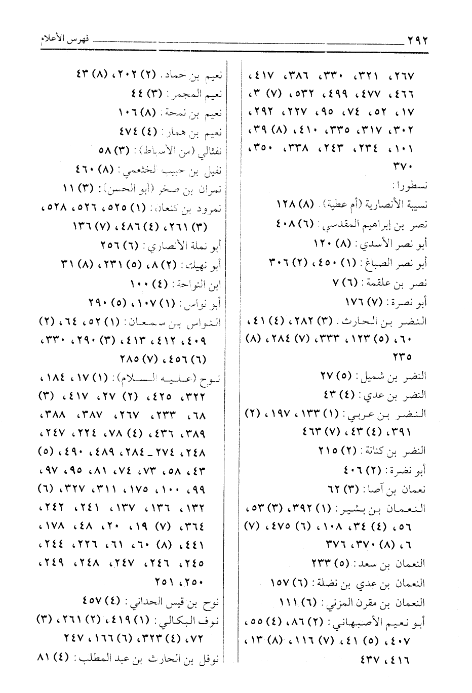 نسيبة الأنصارية (أم عطية) : (8) 128 نصر بن إبراهيم المقدسي: (6) 408 أبو نصر الأسدي: (8) 120 أبو نصر الصباغ: (1) 450، (2) 306 نصر بن علقمة: (6) 7 أبو نصرة: (7) 176 النضر بن الحارث: (3) 282، (4) 41، 60، (5) 123، 333، (7) 284، (8) 235 النضر بن شميل: (5) 27 النضر بن عدي: (4) 43 النضر بن عربي: (1) 133، 197، (2) 391، (4) 43، (7) 463 النضر بن كنانة: (2) 215 أبو نضرة: (2) 406 نعمان بن آصا: (3) 62 النعمان بن بشير: (1) 392، (3) 53، 56، (4) 34، 108، (6) 475، (7) 6، (8) 370، 376 النعمان بن سعد: (5) 233 النعمان بن عدي بن نضلة: (6) 157 النعمان بن مقرن المزني: (6) 111 أبو نعيم الأصبهاني: (2) 86، (4) 55، 407، (5) 41، (7) 116، (8) 13، 416، 437 نعيم بن حماد: (2) 202، (8) 43 نعيم المجمر: (3) 44 نعيم بن نمحة: (8) 106 نعيم بن همار: (4) 474 نفثالي (من الأسباط) : (3) 58 نفيل بن حبيب الخثعمي: (8) 460 نمران بن صخر (أبو الحسن) : (3) 11 نمرود بن كنعان: (1) 525، 526، 528، (3) 261، (4) 486، (7) 136 أبو نملة الأنصاري: (6) 256 أبو نهيك: (2) 8، (5) 231، (8) 31 ابن النواحة: (4) 100 أبو نواس: (1) 107، (5) 290 النواس بن سمعان: (1) 52، 64، (2) 409، 412، 413، (3) 290، 330، (6) 456، (7) 285 نوح (عليه السلام) : (1) 17، 184، 322، 425، (2) 27، 417، (3) 68، 233، 267، 387، 388، 389، 436، (4) 78، 224، 247، 248، 274- 284، 489، 490، (5) 43، 58، 73، 74، 81، 95، 97، 99، 100، 175، 311، 327، (6) 132، 136، 137، 241، 242، 364، (7) 19، 20، 48، 178، 441، (8) 60، 61، 226، 244، 245، 246، 247، 248، 249، 250، 251 نوح بن قيس الحداني: (4) 457 نوف البكالي: (1) 419، (2) 261، (3) 72، (4) 323، (6) 166، 247 نوفل بن الحارث بن عبد المطلب: (4) 81