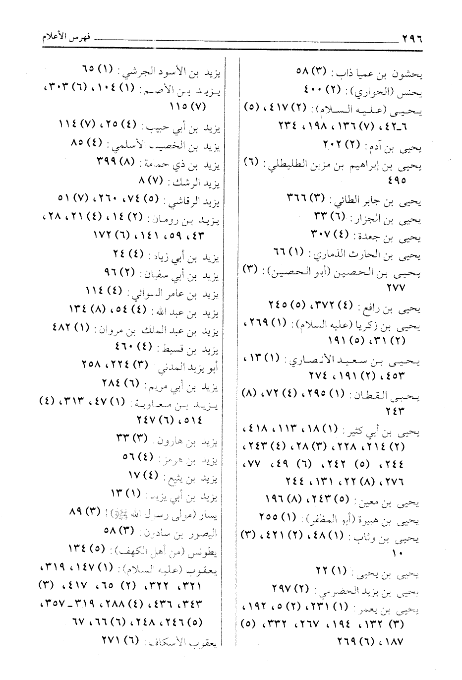 يحشون بن عمياذاب: (3) 58 يحنس (الحواري) : (2) 400 يحيى (عليه السلام) : (2) 417، (5) 6- 42، (7) 136، 198، 234 يحيى بن آدم: (2) 202 يحيى بن إبراهيم بن مزين الطليطلي: (6) 495 يحيى بن جابر الطائي: (3) 366 يحيى بن الجزار: (6) 33 يحيى بن جعدة: (4) 307 يحيى بن الحارث الذماري: (1) 66 يحيى بن الحصين (أبو الحصين) : (3) 277 يحيى بن رافع: (4) 372، (5) 245 يحيى بن زكريا (عليه السلام) : (1) 269، (2) 31، (5) 191 يحيى بن سعيد الأنصاري: (1) 13، 453، (2) 191، 274 يحيى القطان: (1) 295، (4) 72، (8) 243 يحيى بن أبي كثير: (1) 18، 113، 418، (2) 214، 228، (3) 28، (4) 243، 244، (5) 242، (6) 49، 77، 276، (8) 22، 131، 244 يحيى بن معين: (5) 243، (8) 196 يحيى بن هبيرة (أبو المظفر) : (1) 255 يحيى بن وثاب: (1) 48، (2) 421، (3) 10 يحيى بن يحيى: (1) 22 يحيى بن يزيد الحضرمي: (2) 297 يحيى بن يعمر: (1) 231، (2) 5، 192، (3) 132، 194، 267، 332، (5) 187، (6) 269 يزيد بن الأسود الجرشي: (1) 65 يزيد بن الأصم: (1) 104، (6) 303، (7) 115 يزيد بن أبي حبيب: (4) 25، (7) 114 يزيد بن الخصيب الأسلمي: (4) 85 يزيد بن ذي حمامة: (8) 399 يزيد الرشك: (7) 8 يزيد الرقاشي: (5) 74، 260، (7) 51 يزيد بن رومان: (2) 14، (4) 21، 28، 43، 59، 141، (6) 172 يزيد بن أبي زياد: (4) 24 يزيد بن أبي سفيان: (2) 96 يزيد بن عامر السوائي: (4) 114 يزيد بن عبد الله: (4) 54، (8) 134 يزيد بن عبد الملك بن مروان: (1) 482 يزيد بن قسيط: (4) 460 أبو يزيد المدني: (3) 224، 258 يزيد بن أبي مريم: (6) 284 يزيد بن معاوية: (1) 47، 313، (4) 514، (6) 247 يزيد بن هارون: (3) 33 يزيد بن هرمز: (4) 56 يزيد بن يثيع: (4) 17 يزيد بن أبي يزيد: (1) 13 يسار (مَوْلَى رَسُولِ اللَّهِ صَلَّى اللَّهُ عَلَيْهِ وَسَلَّمَ) : (3) 89 اليصور بن سادون: (3) 58 يطونس (من أهل الكهف) : (5) 134 يعقوب (عليه السلام) : (1) 147، 319، 321، 322، (2) 65، 417، (3) 343، 436، (4) 288، 319- 357، (5) 246، 248، (6) 66، 67 يعقوب الإسكاف: (6) 271