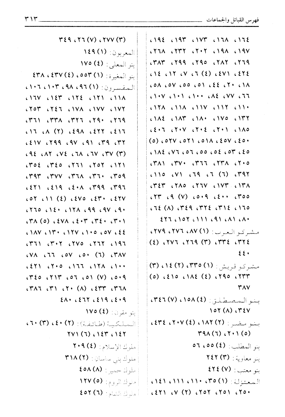 164، 168، 173، 193، 194، 197، 198، 202، 232، 268، 269، 282، 295، 299، 383، 424، 471، (4) 6، 7، 12، 14، 18، 20، 44، 51، 55، 57، 58، 66، 77، 84، 100، 101، 107، 110، 112، 117، 118، 128، 132، 175، 180، 183، 184، 185، 201، 204، 207، 406، 450، 457، 518، 521، 527، (5) 45، 53، 54، 55، 56، 76، 184، 205، 238، 366، 370، 381، 392، (6) 6، 69، 71، 115، 138، 173، 267، 285، 343، 355، 400، 509، (7) 9، 23، 165، 314، 324، 349، (8) 64، 80، 81، 91، 111، 152، 426 مشركو العرب: (1) 87، 276، 279، 324، 334، (3) 269، 276، (4) 440 مشركو قريش: (1) 335، (2) 14، (3) 233، 295، (4) 184، 415، (5) 387 بنو المصطلق: (4) 158، (7) 346، 347، (8) 152 بنو مضر: (2) 182، (4) 207، 434، (5) 201، (6) 398 بنو المطلب: (4) 55، 56 بنو معاوية: (3) 242 بنو معتب: (7) 424 المعتزلة: (1) 35، 110، 111، 141، 250، 251، 252، (2) 7، 421، (3) 277، (7) 26، 349 المعربون: (1) 149 بنو المعلى: (4) 175 بنو المغيرة: (1) 553، (4) 437، 438 المفسرون: (1) 96، 98، 103، 106، 118، 121، 124، 143، 167، 172، 177، 178، 246، 253، 269، 290، 326، 338، 361، 416، 422، 498، (2) 8، 16، 32، 39، 91، 97، 299، 417، (3) 37، 67، 68، 74، 82، 94، 121، 252، 261، 345، 354، 359، 360، 368، 377، 393، 396، 399، 408، 419، 421، 427، 430، 475، (4) 11، 52، 90، 97، 99، 128، 140، 265، 301، 340، 403، 478، (5) 38، 44، 57، 105، 127، 130، 187، 196، 262، 275، 302، 361، 387، (6) 50، 57، 66، 78، 100، 128، 166، 205، 421، 509، (7) 51، 56، 213، 345، 368، 433، (8) 20، 31، 386، 409، 419، 462، 480 بنو مقرن: (4) 175 الملكية (طائفة) : (2) 40، (3) 60، 142، 143، (6) 271 ملوك الإسلام: (4) 209 ملوك بني ساسان: (2) 318 ملوك حمير: (8) 458 ملوك الروم: (5) 127 ملوك الشام: (6) 452