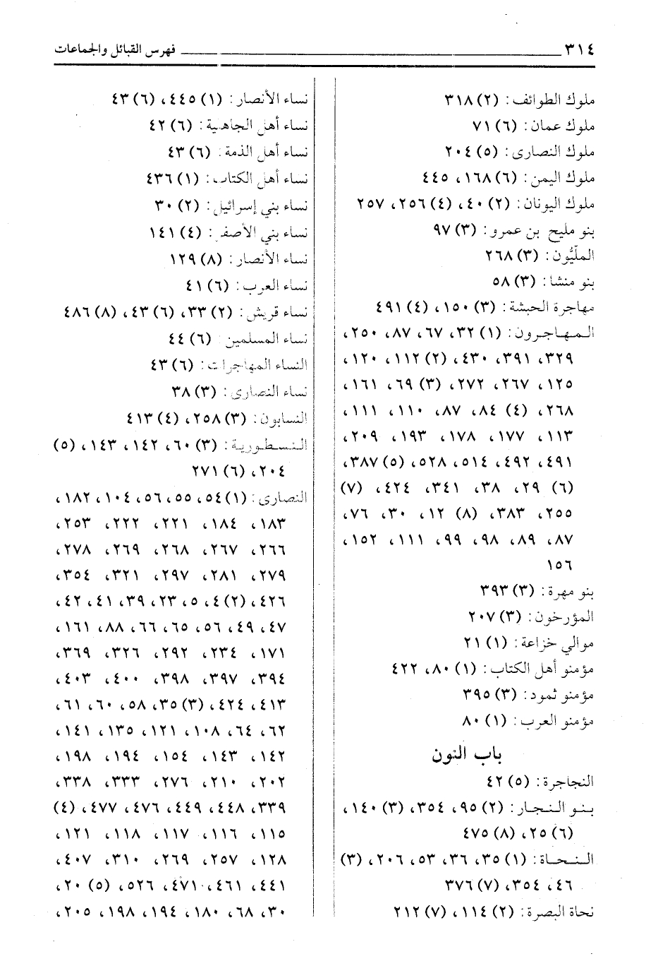 النجاجرة: (5) 42 بنو النجار: (2) 95، 354، (3) 140، (6) 25، (8) 475 النحاة: (1) 35، 36، 53، 206، (3) 46، 354، (7) 376 نحاة البصرة: (2) 114، (7) 212 نساء الأنصار: (1) 445، (6) 43 نساء أهل الجاهلية: (6) 42 نساء أهل الذمة: (6) 43 نساء أهل الكتاب: (1) 436 نساء بني إسرائيل: (2) 30 نساء بني الأصفر: (4) 141 نساء الأنصار: (8) 129 نساء العرب: (6) 41 نساء قريش: (2) 33، (6) 43، (8) 486 نساء المسلمين: (6) 44 النساء المهاجرات: (6) 43 نساء النصارى: (3) 38 النسابون: (3) 258، (4) 413 النسطورية: (3) 60، 142، 143، (5) 204، (6) 271 النصارى: (1) 54، 55، 56، 104، 182، 183، 184، 221، 222، 253، 266، 267، 268، 269، 278، 279، 281، 297، 321، 354، 426، (2) 4، 5، 23، 39، 41، 42، 47، 49، 56، 65، 66، 88، 161، 171، 234، 292، 326، 369، 394، 397، 398، 400، 403، 413، 424، (3) 35، 58، 60، 61، 62، 64، 108، 121، 135، 141، 142، 143، 154، 194، 198، 202، 210، 276، 333، 338، 339، 448، 449، 476، 477، (4) 115، 116، 117، 118، 121، 128، 257، 269، 310، 407، 441، 461، 471، 526، (5) 20، 30، 68، 180، 194، 198، 205،