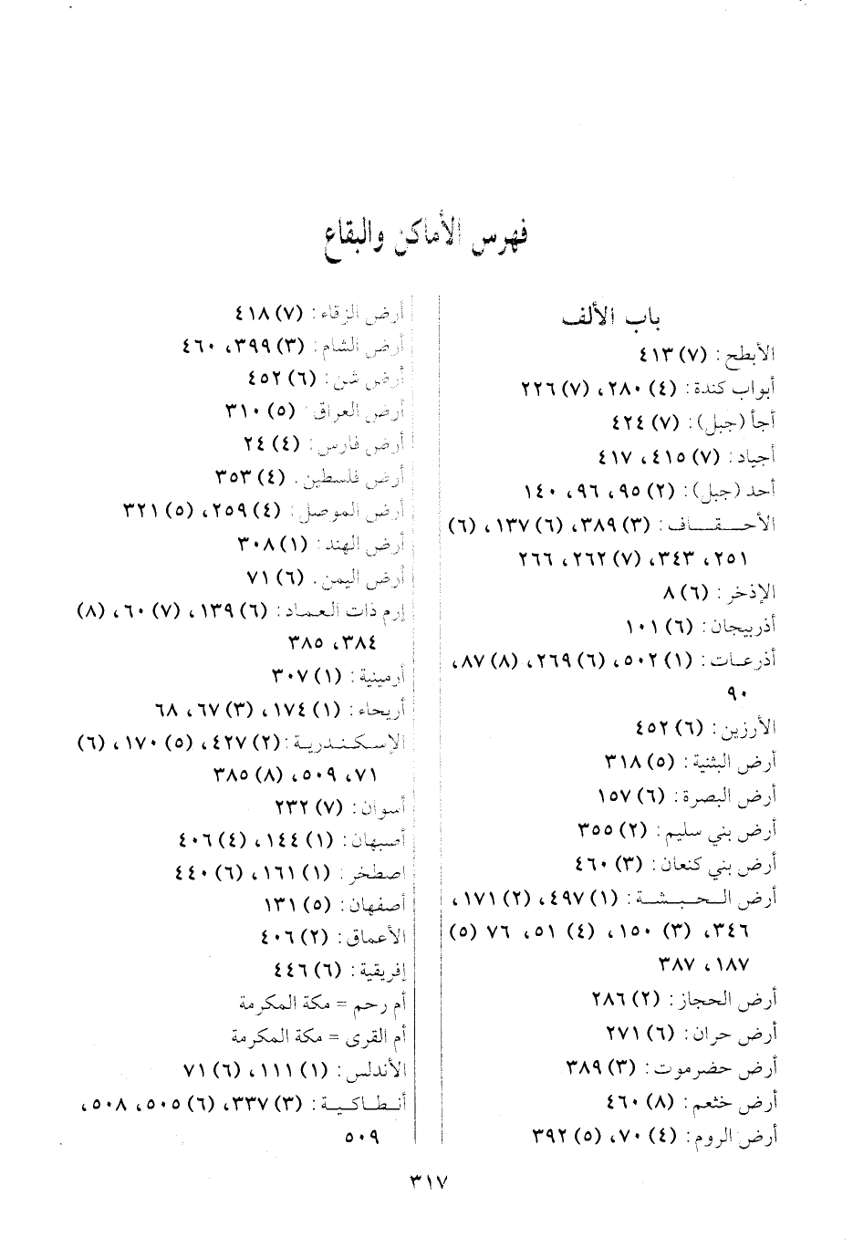 الأبطح: (7) 413 أبواب كندة: (4) 280، (7) 226 أجأ (جبل) : (7) 424 أجياد: (7) 415، 417 أحد (جبل) : (2) 95، 96، 140 الأحقاف: (3) 389، (6) 137، (6) 251، 343، (7) 262، 266 الإذخر: (6) 8 أذربيجان: (6) 101 أذرعات: (1) 502، (6) 269، (8) 87، 90 الأرزين: (6) 452 أرض البثنية: (5) 318 أرض البصرة: (6) 157 أرض بني سليم: (2) 355 أرض بني كنعان: (3) 460 أرض الحبشة: (1) 497، (2) 171، 346، (3) 150، (4) 51، 76، (5) 187، 387 أرض الحجاز: (2) 286 أرض حران: (6) 271 أرض حضر موت: (3) 389 أرض خثعم: (8) 460 أرض الروم: (4) 70، (5) 392 أرض الزقاء: (7) 418 أرض الشام: (3) 399، 460 أرض شن: (6) 452 أرض العراق: (5) 310 أرض فارس: (4) 24 أرض فلسطين: (4) 353 أرض الموصل: (4) 259، (5) 321 أرض الهند: (1) 308 أرض اليمن: (6) 71 إرم ذات العماد: (6) 139، (7) 60، (8) 384، 385 أرمينية: (1) 307 أريحاء: (1) 174، (3) 67، 68 الإسكندرية: (2) 427، (5) 170، (6) 71، 509، (8) 385 أسوان: (7) 232 أصبهان: (1) 144، (4) 406 إصطخر: (1) 161، (6) 440 أصفهان: (5) 131 الأعماق: (2) 406 إفريقية: (6) 446 أم رحم مكة المكرمة أم القرى مكة المكرمة الأندلس: (1) 111، (6) 71 أنطاكية: (3) 337، (6) 505، 508، 509
