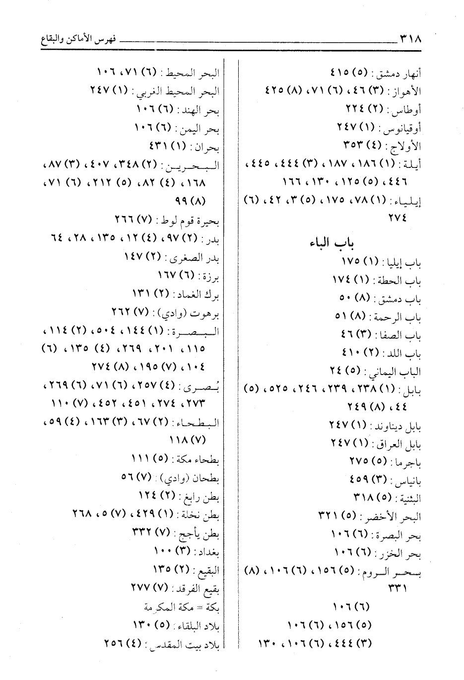 باب إيليا: (1) 175 باب الحطة: (1) 174 باب دمشق: (8) 50 باب الرحمة: (8) 51 باب الصفا: (3) 46 باب اللد: (2) 410 الباب اليماني: (5) 24 بابل: (1) 238، 239، 246، 525، (5) 44، (8) 249 بابل ديناوند: (1) 247 بابل العراق: (1) 247 باجرما: (5) 275 بانياس: (3) 459 البثنية: (5) 318 البحر الأخضر: (5) 321 بحر البصرة: (6) 106 بحر الخزر: (6) 106 بحر الروم: (5) 156، (6) 106، (8) 331 (6) 106 (5) 156، (6) 106 (3) 444، (6) 106، 130 البحر المحيط: (6) 71، 106 البحر المحيط الغربي: (1) 247 بحر الهند: (6) 106 بحر اليمن: (6) 106 بحران: (1) 431 البحرين: (2) 348، 407، (3) 87، 168، (4) 82، (5) 212، (6) 71، (8) 99 بحيرة قوم لوط: (7) 266 بدر: (2) 97، (4) 12، 135، 28، 64 بدر الصغرى: (2) 147 برزة: (6) 167 برك الغماد: (2) 131 برهوت (وادي) : (7) 262 البصرة: (1) 144، 504، (2) 114، 115، 201، 269، (4) 135، (6) 104، (7) 195، (8) 274 بصرى: (4) 257، (6) 71، (6) 269، 273، 274، 451، 452، (7) 110 البطحاء: (2) 67، (3) 163، (4) 59، (7) 118 بطحاء مكة: (5) 111 بطحان (وادي) : (7) 56 بطن رابغ: (2) 124 بطن نخلة: (1) 429، (7) 5، 268 بطن يأجج: (7) 332 بغداد: (3) 100 البقيع: (2) 135 بقيع الفرقد: (7) 277 بكة مكة المكرمة بلاد البلقاء: (5) 130 بلاد بيت المقدس: (4) 256
