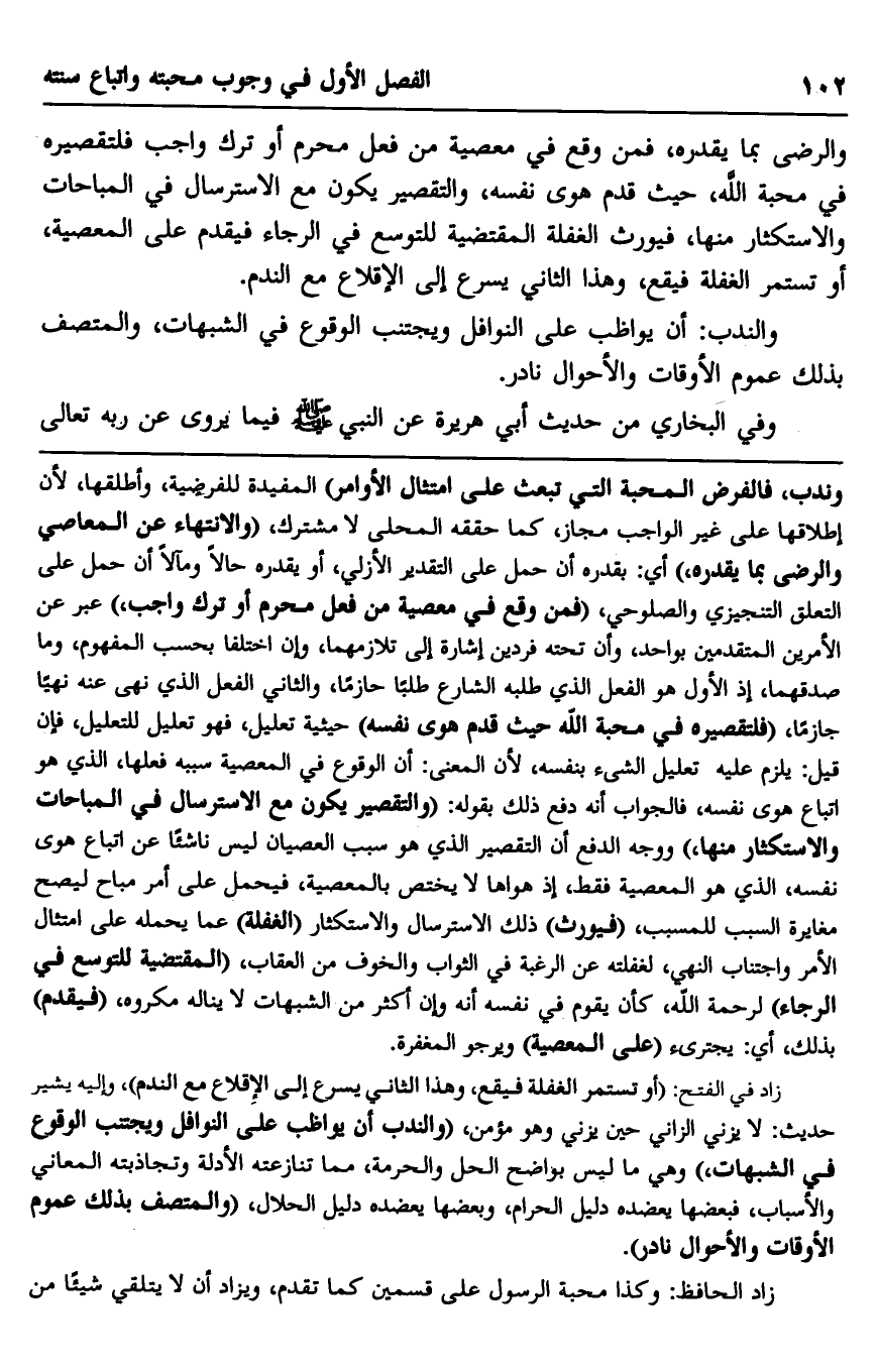 وندب، فالفرض المحبة التي تبعث على امتثال الأوامر" المفيدة للفرضية، وأطلقها؛ لأن إطلاقها على غير الواجب مجاز، كما حققه المحلى لا مشترك، "والانتهاء عن المعاصي والرضى بما يقدره" أي: بقدره أن حمل على التقدير الأزلي، أو يقدره حالًا ومآلًا أن حمل على التعلق التنجيزي والصلوحي، "فمن وقع في معصية من فعل محرم أو ترك واجب"، عبر عن الأمرين المتقدمين بواحد، وأن تحته فردين إشارة إلى تلازمهما، وإن اختلفا بحسب المفهوم، وما صدقهما؛ إذ الأول هو الفعل الذي طلبه الشارع طلبًا حازمًا، والثاني الفعل الذي نهى عنه نهيًا جازمًا، "فلتقصيره في محبة الله حيث قدم هوى نفسه" حيثية تعليل، فهو تعليل للتعليل، فإن قيل: يلزم عليه تعليل الشيء بنفسه؛ لأن المعنى: أن الوقوع في المعصية سببه فعلها، الذي هو اتباع هوى نفسه، فالجواب أنه دفع ذلك بقوله: "والتقصير يكون مع الاسترسال في المباحات والاستكثار منها"، ووجه الدفع أن التقصير الذي هو سبب العصيان ليس ناشئًا عن اتباع هوى نفسه، الذي هو المعصية فقط؛ إذ هواها لا يختص بالمعصية، فيحمل على أمر مباح ليصح مغايرة السبب للمسبب "فيورث" ذلك الاسترسال والاستكثار "الغفلة" عما يحمله على امتثال الأمر واجتناب النهي، لغفلته عن الرغبة في الثواب والخوف من العقاب، "المقتضية للتوسع في الرجاء" لرحمة الله، كأن يقوم في نفسه أنه وإن أكثر من الشبهات لا يناله مكروه، "فيقدم" بذلك، أي: يجترئ "على المعصية" ويرجو المغفرة.