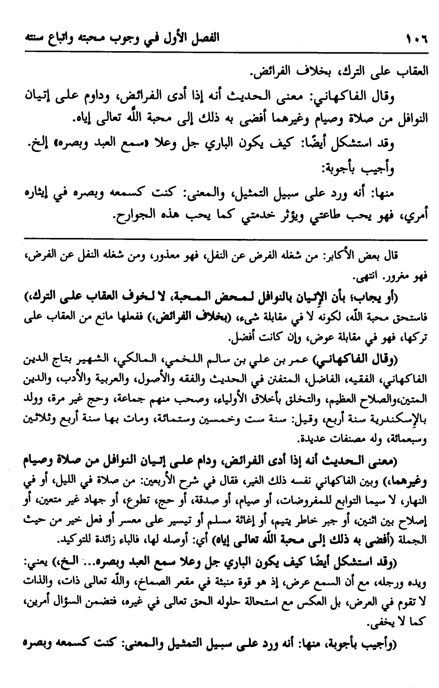وقال الفاكهاني: معنى الحديث أنه إذا أدى الفرائض، وداوم على إتيان النوافل من صلاة وصيام وغيرهما أفضى به ذلك إلى محبة الله تعالى إياه.