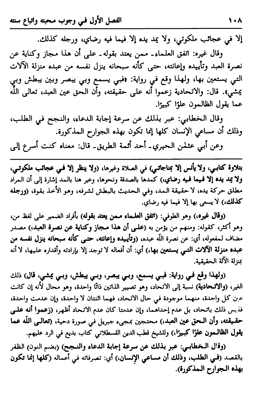 وقال غيره: اتفق العلماء -ممن يعتد بقوله- على أن هذا مجاز وكناية عن نصرة العبد وتأييده وإعانته، حتى كأنه سبحانه ينزل نفسه من عبده منزلة الآلات التي يستعين بها، ولهذا وقع في رواية: "فبي يسمع وبي يبصر وبي يبطش وبي يمشي"، قال: والاتحادية زعموا أنه على حقيقته، وأن الحق عين العبد، تعالى الله عما يقول الظالمون علوًّا كبيرًا.