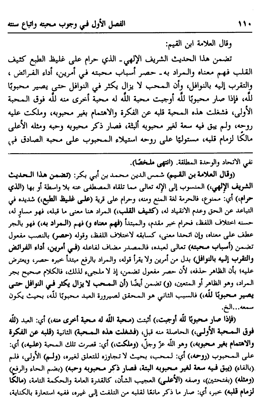 تضمن هذا الحديث الشريف الإلهي -الذي حرام على غليظ الطبع كثيف القلب فهم معناه والمراد به- حصر أسباب محبته في أمرين، أداء الفرائض، والتقرب إليه بالنوافل، وأن المحب لا يزال يكثر في النوافل حتى يصير محبوبًا لله، فإذا صار محبوبًا لله أوجبت محبة الله له محبة أخرى منه لله فوق المحبة الأولى، فشغلت هذه المحبة قلبه عن الفكرة والاهتمام بغير محبوبه، وملكت عليه روه، ولم يبق فيه سعة لغير محبوبة ألبثة، فصار ذكر محبوبة وحبه ومثله الأعلى مالكًا لزمام قلبه، مستوليًا على روحه استيلاء المحبوب على محبة الصادق في