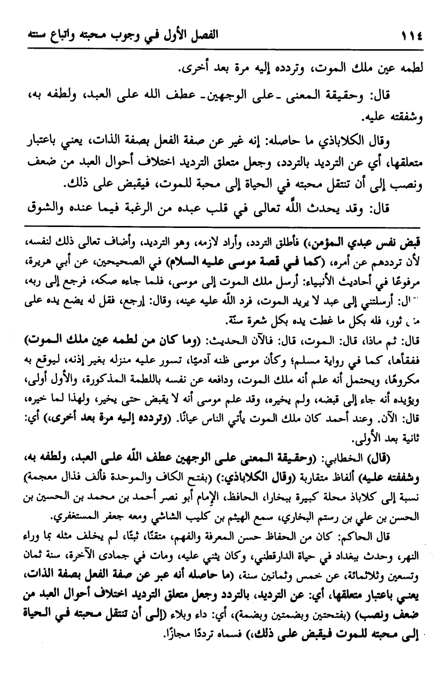 وقال الكلاباذي ما حاصله: إنه غير عن صفة الفعل بصفة الذات، يعني باعتبار متعلقها، أي عن الترديد بالتردد، وجعل متعلق الترديد اختلاف أحوال العبد من ضعف ونصب إلى أن تنتقل محبته في الحياة إلى محبة للموت، فيقبض على ذلك.