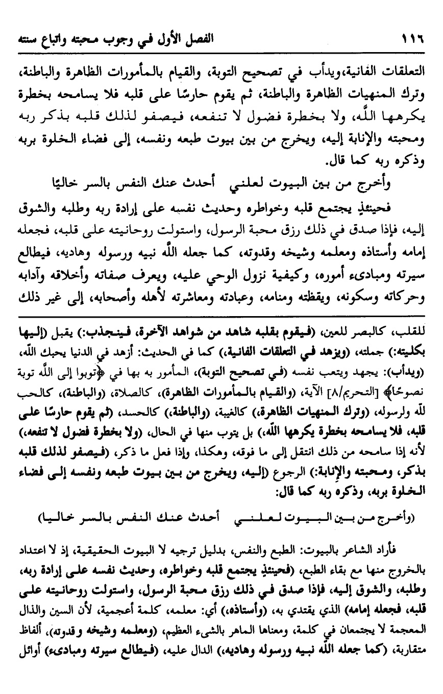 فأراد الشاعر بالبيوت: الطبع والنفس، بدليل ترجيه لا البيوت الحقيقية؛ إذ لا اعتداد بالخروج منها مع بقاء الطبع "فحينئذٍ يجتمع قلبه وخواطره، وحديث نفسه على إرادة ربه، وطلبه، والشوق إليه، فإذا صدق في ذلك رزق محبة الرسول، واستولت روحانيته على قلبه، فجعله إمامه" الذي يقتدي به "وأستاذه" أي: معلمه، كلمة أعجمية؛ لأن السين والذال المعجمة لا يجتمعان في كلمة، ومعناها الماهر بالشيء العظيم "ومعلمه وشيخه وقدوته" ألفاظ متقاربة "كما جعله الله نبيه ورسوله وهاديه"، الدال عليه، "فيطالع سيرته ومبادئ" أوائل