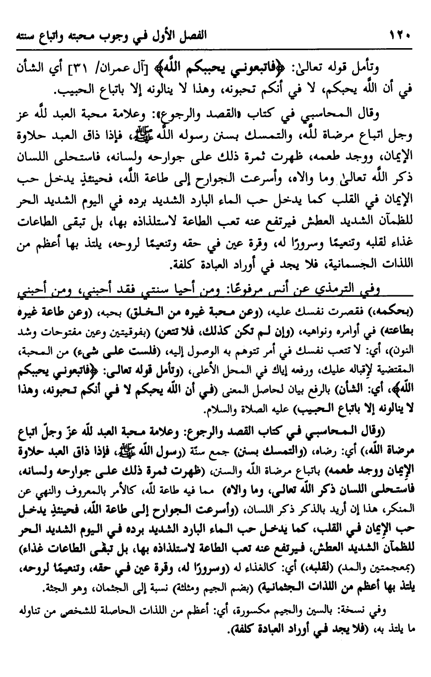 وقال المحاسبي في كتاب "القصد والرجوع": وعلامة محبة العبد لله عز وجل اتباع مرضاة الله، والتمسك بسنن رسوله الله صلى الله عليه وسلم، فإذا ذاق العبد حلاوة الإيمان، ووجد طعمه، ظهرت ثمرة ذلك على جوارحه ولسانه، فاستحلى اللسان ذكر الله تعالى وما والاه، وأسرعت الجوارح إلى طاعة الله، فحينئذٍ يدخل حب الإيمان في القلب كما يدخل حب الماء البارد الشديد برده في اليوم الشديد الحر للظمآن الشديد العطش فيرتفع عنه تعب الطاعة لاستلذاذه بها، بل تبقى الطاعات غذاء لقلبه وتنعيمًا وسرورًا له، وقرة عين في حقه وتنعيمًا لروحه، يلتذ بها أعظم من اللذات الجسمانية، فلا يجد في أوراد العبادة كلفة.