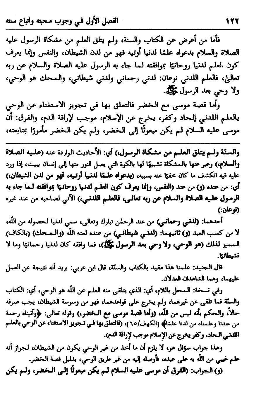 فأما من أعرض عن الكتاب والسنة، ولم يتلق العلم من مشكاة الرسول عليه الصلاة والسلام بدعواه علمًا لدنيا أوتيه فهو من لدن الشيطان والنفس وإنما يعرف كون العلم لدنيا روحانيًّا بموافقته لما جاء به الرسول عليه الصلاة والسلام عن ربه تعالى، فالعلم اللدني نوعان: لدني رحماني ولدني شيطاني، والمحك هو الوحي، ولا وحي بعد الرسول صلى الله عليه وسلم.
