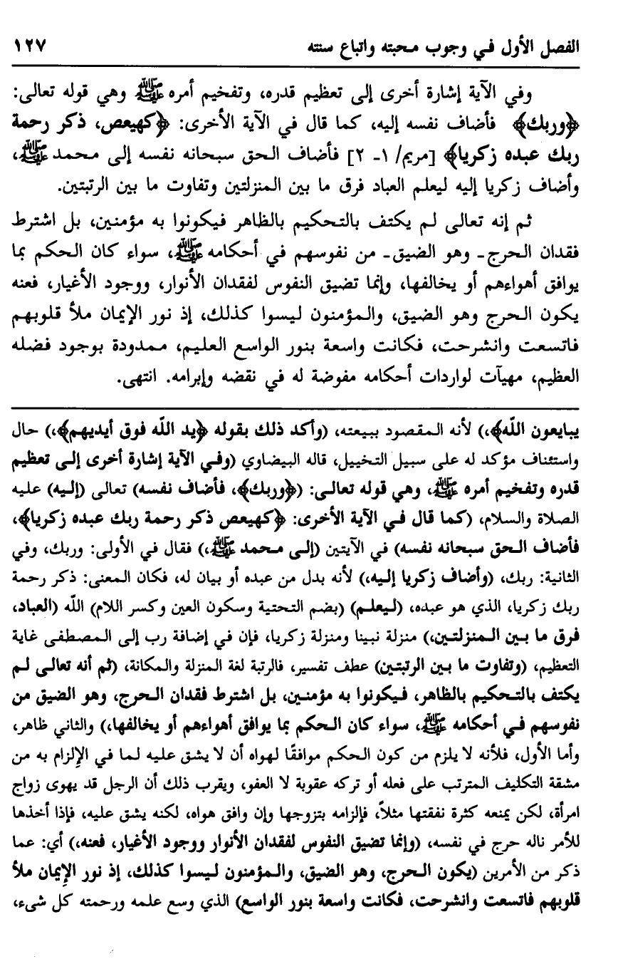 يُبَايِعُونَ اللَّهَ} لأنه المقصود ببيعته، "وأكد ذلك بقوله: {يَدُ اللَّهِ فَوَْ أَيْدِيهِمْ} ، حال واستئناف مؤكد له على سبيل التخييل، قاله البيضاوي "وفي الآية إشارة أخرى إلى تعظيم قدره وتفخيم أمره صلى الله عليه وسلم، وهي قوله تعالى: {وَرَبَّكَ} فأضاف نفسه تعالى "إليه" عليه الصلاة والسلام، "كما قال في الآية الأخرى: {كهيعص، ذِكْرُ رَحْمَتِ رَبِّكَ عَبْدَهُ زَكَرِيَّا} ، فأضاف الحق سبحانه نفسه، في الآيتين "إلى محمد صلى الله عليه وسلم" فقال في الأولى: وربك وفي الثانية: ربك "وأضاف زكريا إليه"؛ لأنه بدل من عبده أو بيان له، فكان المعنى: ذكر رحمة ربك زكريا، الذي هو عبده "ليعلم" "بضم التحتية وسكون العين وكسر اللام" الله "العباد، فرق ما بين المنزلتين"، منزلة نبينا ومنزلة زكريا، فإن في إضافة رب إلى المصطفى غاية التعظيم، "وتفاوت ما بين الرتبتين" عطف تفسير، فالرتبة لغة المنزلة والمكانة، "ثم إنه تعالى لم يكتف بالتحكيم بالظاهر، فيكونوا به مؤمنين، بل اشترط فقدان الحرج، وهو الضيق من نفوسهم في أحكامه صلى الله عليه وسلم، سواء كان الحكم بما يوافق أهواءهم أو يخالفها، والثاني ظاهر وأما الأول، فلأنه لا يلزم من كونه الحكم موافقًا لهاه أن لا يشق عليه لما في الإلزام به من مشقة التكليف المترتب على فعله أو تركه عقوبة لا العفو، ويقرب ذلك أن الرجل قد يهوى زواج امرأة، لكن يمنعه كثرة نفقتها مثلًا، فإلزامه بتزوجها وإن وافق هواه، لكنه يشق عليه، فإذا أخذها للأمر ناله حرج في نفسه، "وإنما تضيق النفوس لفقدان الأنوار ووجود الأغيار، فعنه" أي: عما ذكر من الأمرين "يكون الحرج، وهو الضيق، والمؤمنون ليسوا كذلك؛ إذ نور الإيمان ملأ قلوبهم فاتسعت وانشرحت، فكانت واسعة بنور الواسع" الذي وسع علمه ورحمته كل شيء،
