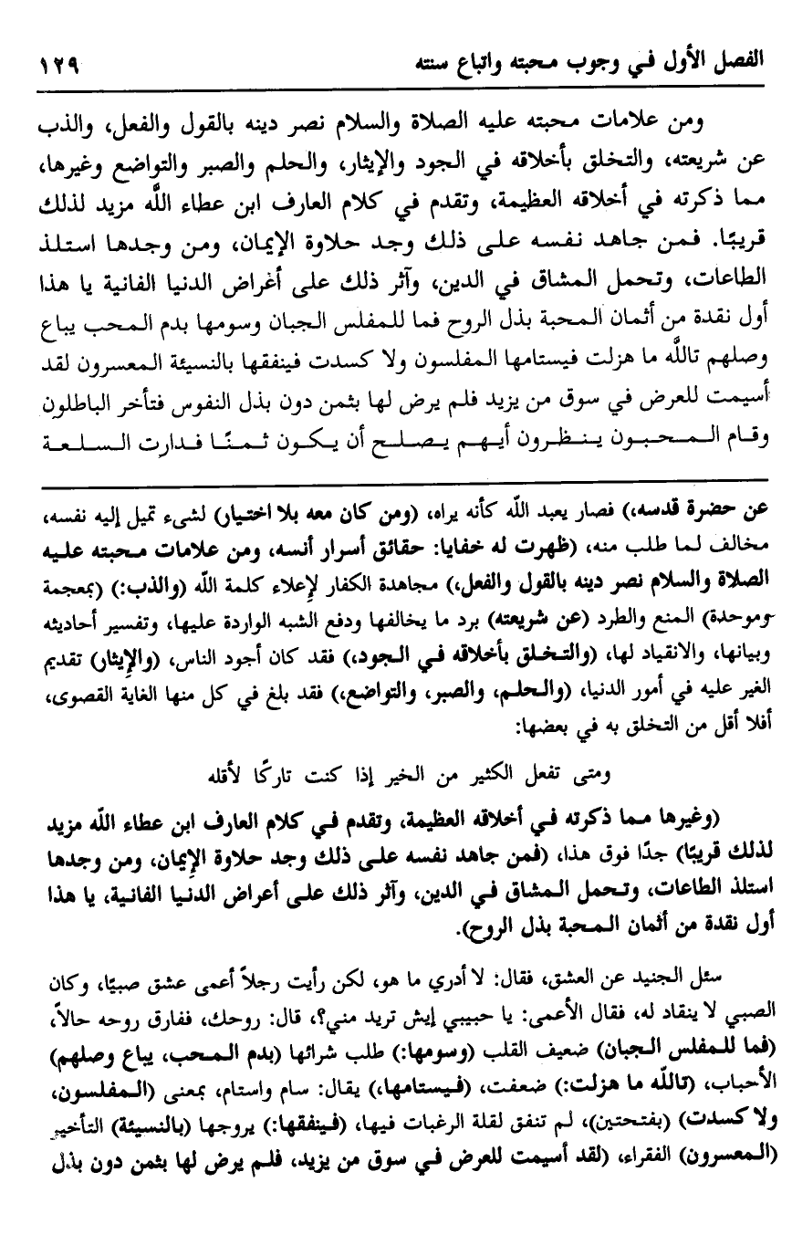 ومن علامات محبته عليه الصلاة والسلام نصر دينه بالقول والفعل، والذب عن شريعته، والتخلق بأخلاقه في الجود والإيثار، والحلم والصبر والتواضع وغيرها، مما ذكرته في أخلاقه العظيمة، وتقدم في كلام العارف ابن عطاء الله مزيد لذلك قريبًا. فمن جاهد نفسه على ذلك وجد حلاوة الإيمان، ومن وجدها استلذ الطاعات، وتحمل المشاق في الدين، وآثر ذلك على أغراض الدنيا الفانية يا هذا أول نقدة من أثمان المحبة بذل الروح فما للمفلس الجبان وسومها بدم المحب يباع وصلهم تالله ما هزلت فيستامها المفلسون ولا كسدت فينفقها بالنسيئة المعسرون لقد أسيمت للعرض في سوق من يزيد فلم يرض لها بثمن دون بذل النفوس فتأخر الباطلون وقام المحبون ينظرون أيهم يصلح أن يكون ثمنًا فدارت السلعة