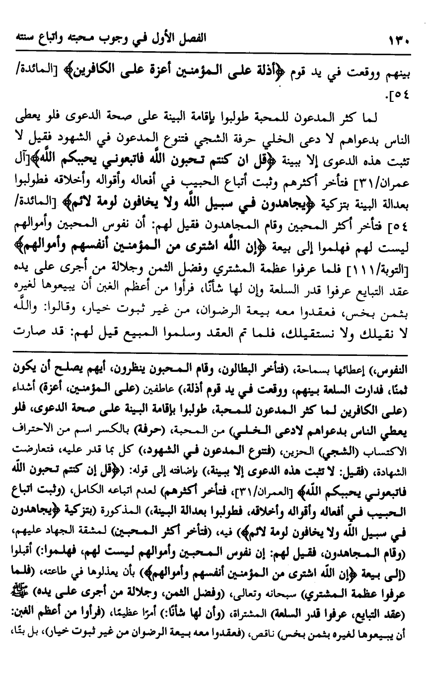 النفوس"، إعطائها بسماحة "فتأخر البطالون، وقام المحبون ينظرون، أيهم يصلح أن يكون ثمنًا فدارت السلعة بينهم، ووقعت في يد قوم أذلة"، عاطفين "على المؤمنين أعزة" أشداء "على الكافرين لما كثر المدعون للمحبة، طولبوا بإقامة البينة على صحة الدعوى، فلو يعطى الناس بدعواهم لا دعى الخلي" من المحبة "حرفة" بالكسر اسم من الاحتراف الاكتساب "الشجي" الحزين "فتنوع المدعون في الشهود"، كل بما قدر عليه، فتعارضت الشهادة "فقيل: لا تثبت هذه الدعوى إلا ببينة" بإضافته إلى قوله: {قُلْ إِنْ كُنْتُمْ تُحِبُّونَ اللَّهَ فَاتَّبِعُونِي يُحْبِبْكُمُ اللَّهُ} [العمران: 31] ، فتأخر أكثرهم" لعدم اتباعه الكامل، "وثبت اتباع الحبيب في أفعاله وأقواله وأخلاقه، فطولبوا بعدالة البينة" المذكورة "بتزكية {يُجَاهِدُونَ فِي سَبِيلِ اللَّهِ وَلَا يَخَافُونَ لَوْمَةَ لَائِمٍ} فيه "فتأخر أكثر المحبين" لمشقة الجهاد عليهم، "وقام المجاهدون، فقيل لهم: إن نفوس المحبين وأموالهم ليست لهم، فهلموا": أقبلوا إلى بيعة {إِنَّ اللَّهَ اشْتَرَى مِنَ الْمُؤْمِنِينَ أَنْفُسَهُمْ وَأَمْوَالَهُمْ} بأن يعذلوها في طاعته، "فلما عرفوا عظمة المشترى" سبحانه وتعالى: "وفضل الثمن، وجلالة من أجرى على يده" صلى الله عليه وسلم "عقد التبايع، عرفوا قدر السلعة" المشتراه، "وأن لها شأنًا": أمرًا عظيمًا، "فرءوا من أعظم الغبن: أن يبيعوها لغيره بثمن بخس" ناقص "فعقدوا معه بيعة الرضوان من غير ثبوت خيار"، بل بتا،