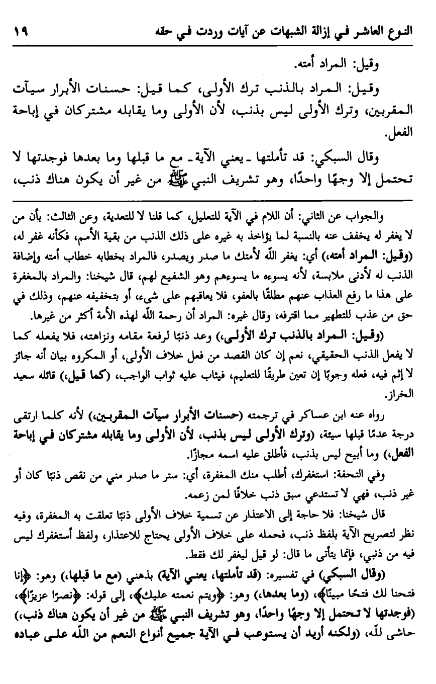 وقال السبكي: قد تأملتها -يعني الآية- مع ما قبلها وما بعدها فوجدتها لا تحتمل إلا وجهًا واحدًا، وهو تشريف النبي صلى الله عليه وسلم من غير أن يكون هناك ذنب،
