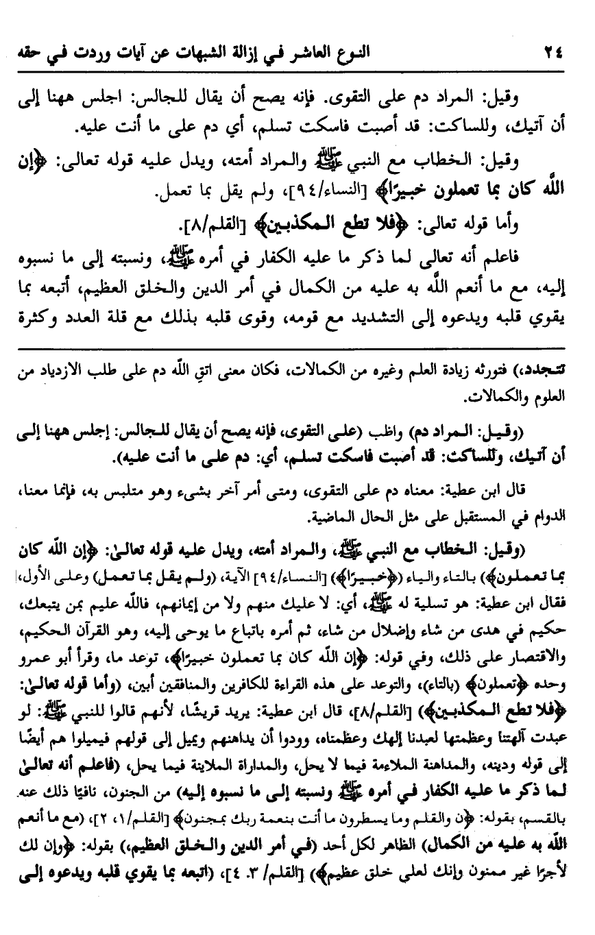 "وقيل: الخطاب مع النبي صلى الله عليه وسلم والمراد أمته، ويدل عليه قوله تعالى: {إِنَّ اللَّهَ كَانَ بِمَا تَعْمَلُونَ} بالتاء والياء {خَبِيرًا} [النساء: 94] الآية، "ولم يقل بما تعمل" وعلى الأول، فقال ابن عطية: هو تسلية له صلى الله عليه وسلم، أي: لا عليك منهم ولا من إيمانهم، فالله عليم بمن يتبعك، حكيم في هدى من شاء وإضلال من شاء، ثم أمره باتباع ما يوحى إليه، وهو القرآن الحكيم، والاقتصار على ذلك وفي قوله: {إِنَّ اللَّهَ كَانَ بِمَا تَعْمَلُونَ خَبِيرًا} ، توعد ما، وقرأ أبو عمرو وحده {تَعْمَلُونَ} "بالتاء"، والتوعد على هذه القراءة للكافرين والمنافقين أبين، وأما قوله تعالى: {فَلَا تُطِعِ الْمُكَذِّبِينَ} [القلم: 8] ، قال ابن عطية: يريد قريشًا، لأنهم قالوا للنبي صلى الله عليه وسلم: لو عبدت آلهتنا وعظمتها لعبدنا إلهك وعظمناه، وودوا أن يداهنهم ويميل إلى قولهم فليميلوا هم أيضًا إلى قوله ودينه، والمداهنة الملاءمة فيما لا يحل، والمداراة الملاينة فيما يحل "فاعلم أنه تعالى لما ذكر ما عليه الكفار في أمره صلى الله عليه وسلم ونسبته إلى ما نسبوه إليه" من الجنون، نافيًا ذلك عنه بالقسم، بقوله: {ن وَالْقَلَمِ وَمَا يَسْطُرُونَ، مَا أَنْتَ بِنِعْمَةِ رَبِّكَ بِمَجْنُونٍ} [القلم: 1، 2] ، "مع ما أنعم الله به عليه من الكمال" الظاهر لكل أحد "في أمر الدين والخلق العظيم"، بقوله: {وَإِنَّ لَكَ لَأَجْرًا غَيْرَ مَمْنُونٍ، وَإِنَّكَ لَعَلى خُلُقٍ عَظِيمٍ} [القلم: 3، 4] ، "ابتعه بما يقوي قلبه ويدعوه إلى