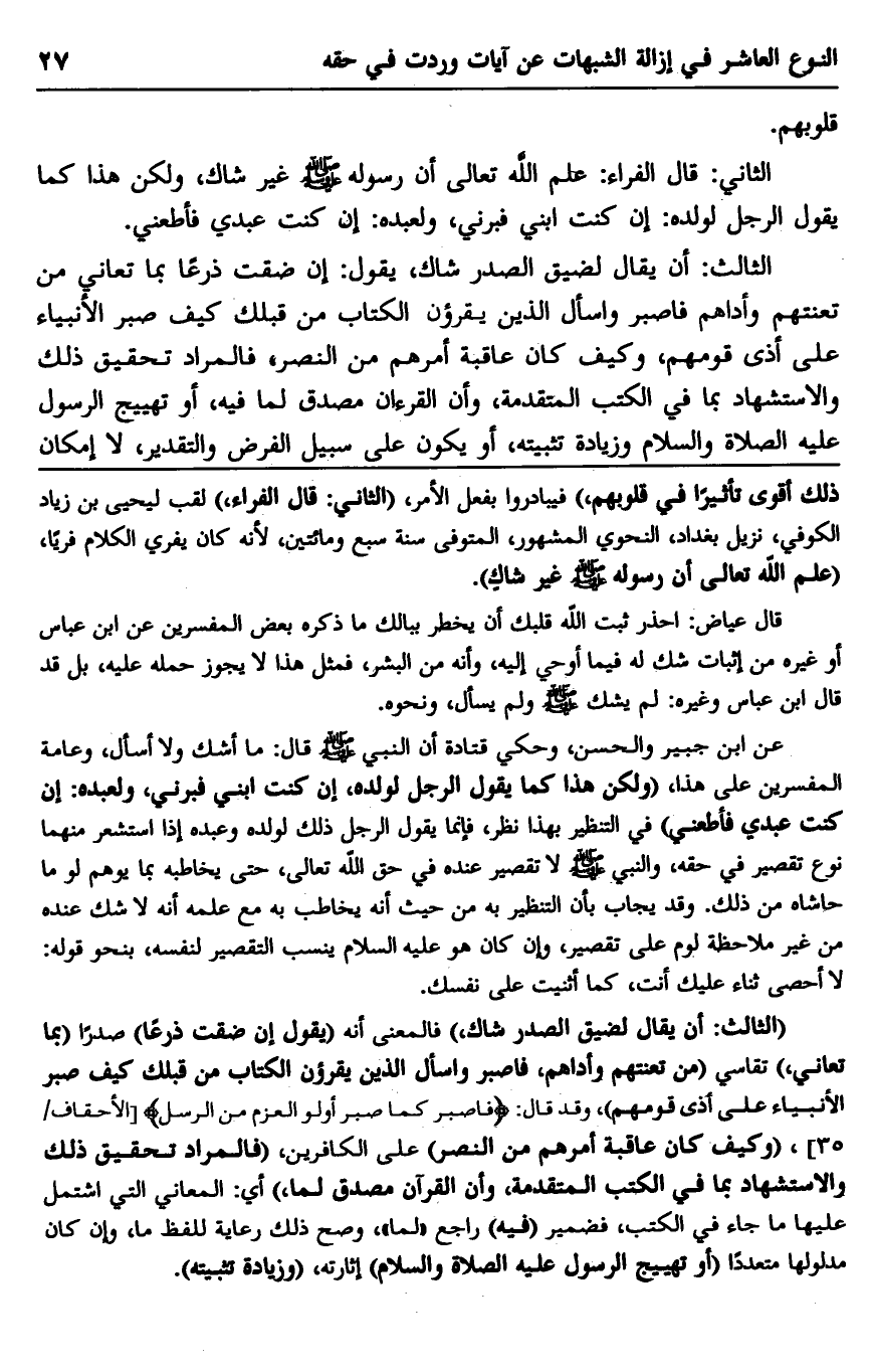 قال عياض: احذر ثبت الله قلبك أن يخطر ببالك ما ذكره بعض المفسرين عن ابن عباس أو غيره من إثبات شك له فيما أوحي إليه، وأنه من البشر، فمثل هذا لا يجوز حمله عليه، بل قد قال ابن عباس وغيره: لم يشك صلى الله عليه وسلم ولم يسأل، ونحوه.